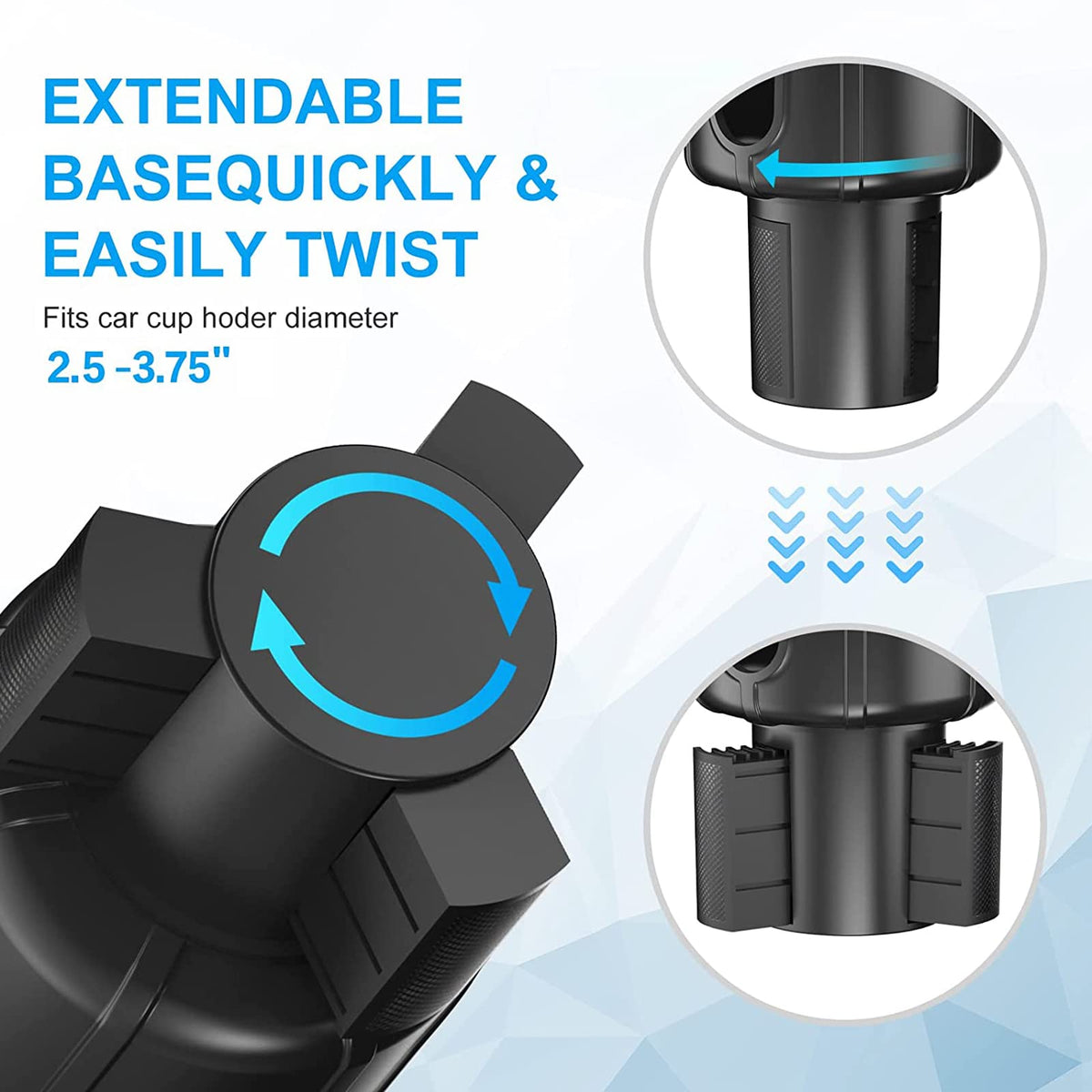 Q: What is the adjustable diameter range of the Car Cup Holder Expander?A: The Car Cup Holder Expander Adapter features an adjustable base that can expand from 2.5 inches to 3.75 inches in diameter, making it compatible with a wide variety of automotive cup holders.