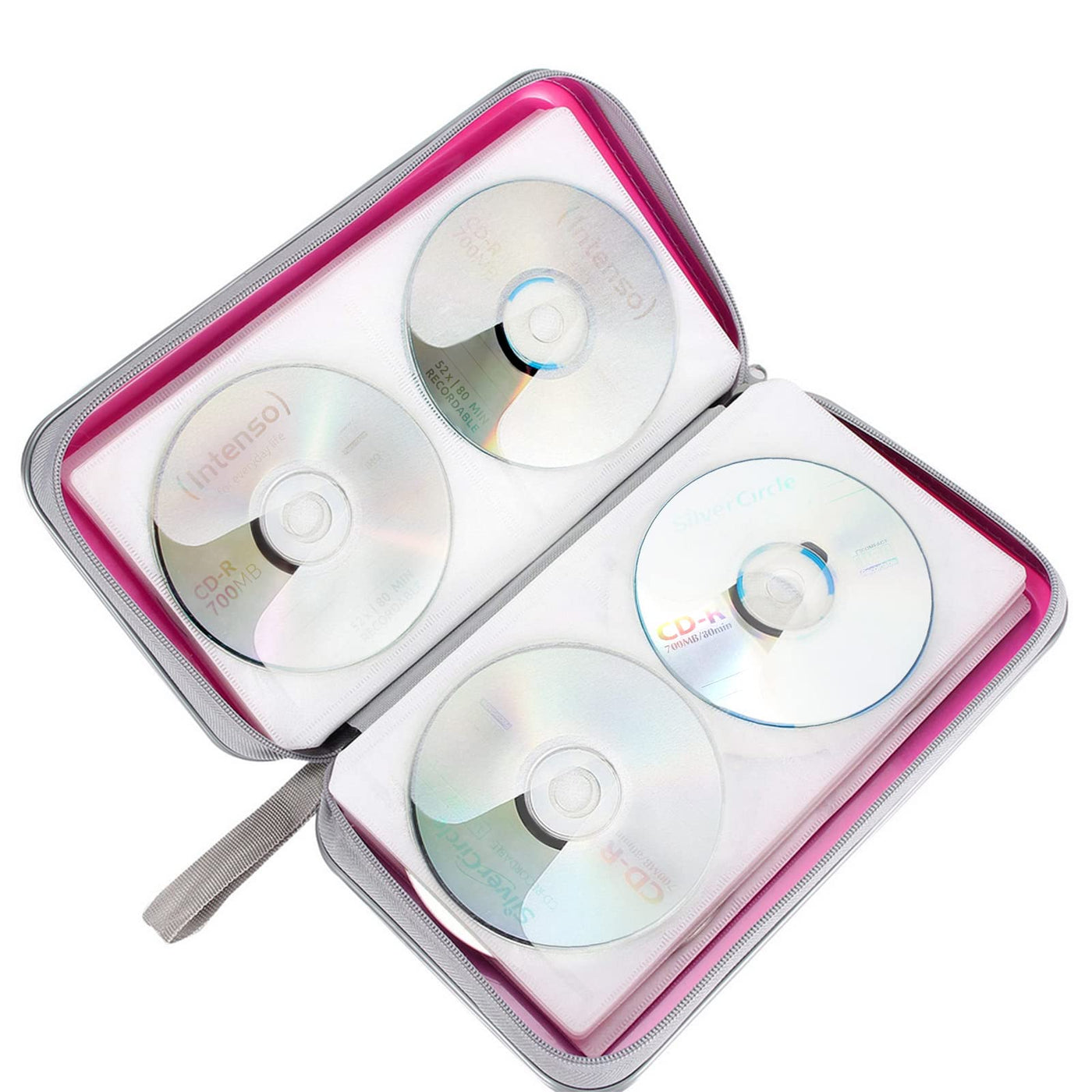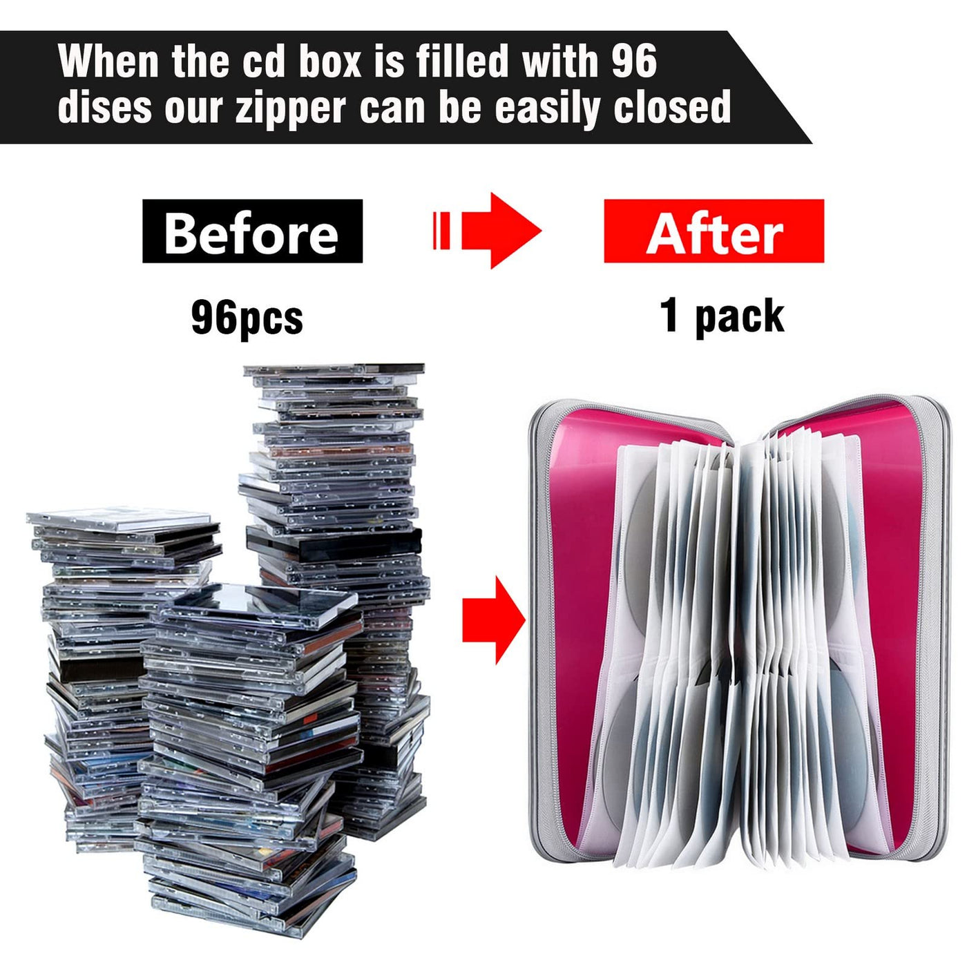 Siveit High Quality Pink 96 Capacity Lightweight Carrying CD/DVD Storage Bag Our Siveit CD case does its job very well. Moisture and strong plastic +PP film + non-woven fabric case design is durable enough to store it anywhere without worrying about your CDs being crushed and scrached. It is compact and portable, holding around 96 CDs or DVDs with zippered closure without being super big and bulky.1.CD CASE SIZE:11.4x6.3x2.4 inch(LxWxH)2.Provides Maximum Protection from Dust, Scratches and other Disk Damage.3.Organizer holds 96 CDs,The already pulled out tabs make it easy for you to slide your discs right into the pockets.4.Transparent Sleeves for Improved Media Organization.5.Total: 1x Siveit Pink CD/DVD Wallet BinderATTENTION: We have upgraded our CD Bags, it holds 96 CDs, and the zipper can be closed easily and perfectly