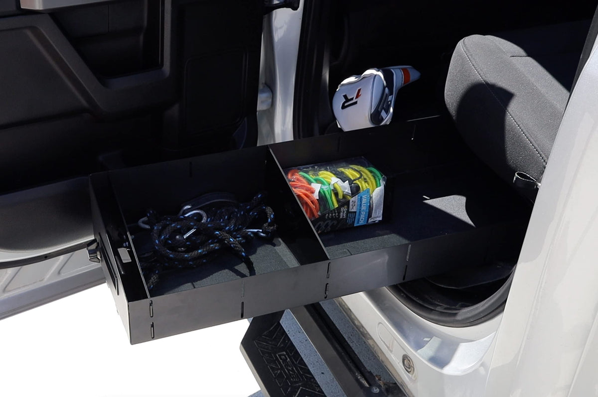 Q: How does the under seat storage drawer enhance organization in my truck?A: This storage drawer maximizes the under seat space by providing lockable storage that is accessible even with the back seats down. It includes three adjustable plastic dividers to help organize your gear effectively, reducing clutter in the cab.