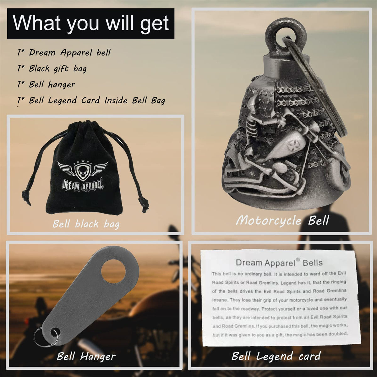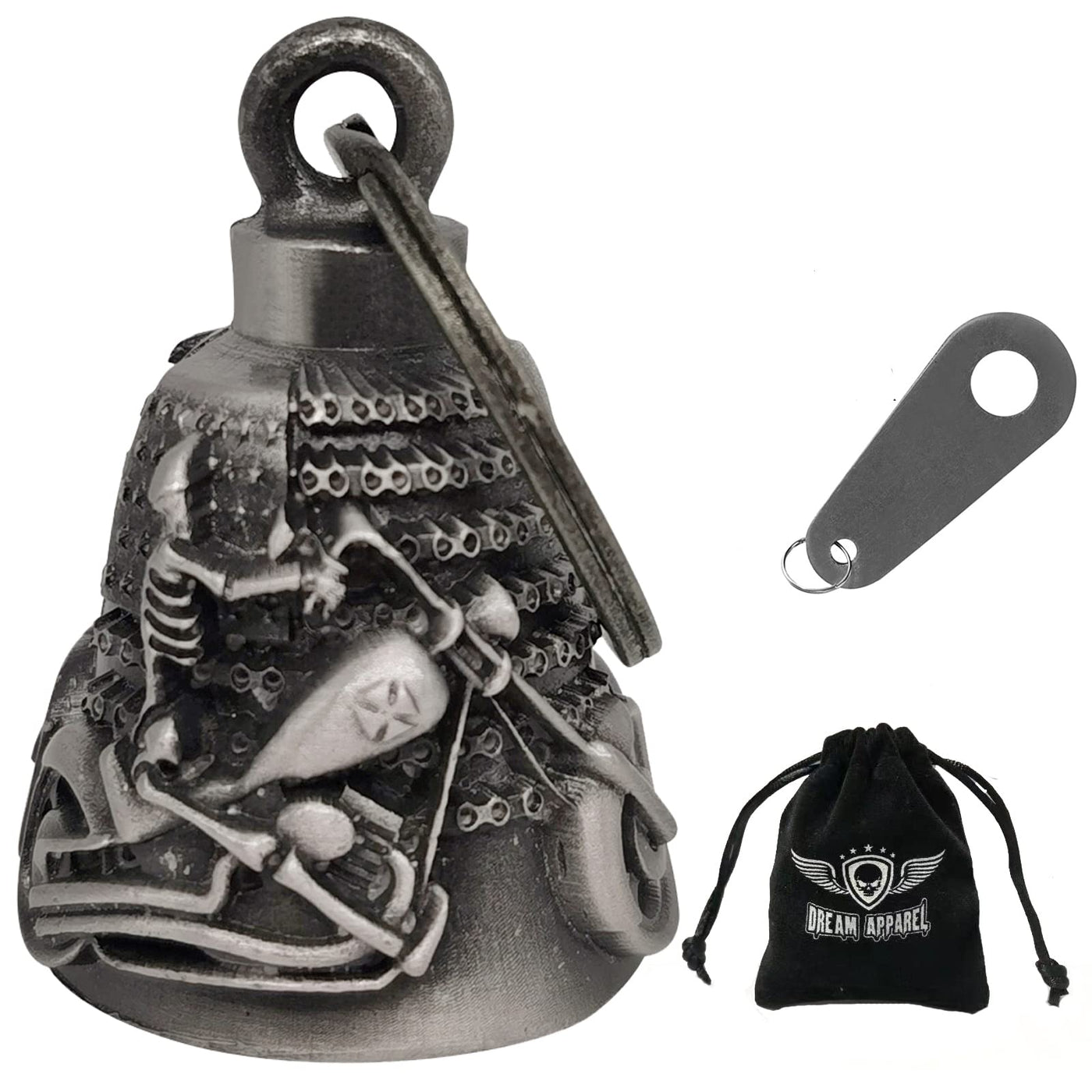 1.Not all Dream Apparel motorcycle bells are created equal, each design has it 's own meanings and stories to keep riders safe and lucky. ,3D designing ride bells makes it more fashion and unique.to the first one to own the biker bells,and ride safe!! 2.Each luck bell comes with 1 hanger+1 black gift bag+1 Legend of the Dream Apparel Bell story card,Measures: 2.75 '' tall ring include, 1.18 ''bottom wide. and weight 0.17lbs,heavy motorcycle bell keeps more sturdy while riding. 3.Dream Apparel road bells are made by finest sterling magnesium alloy with gun metal colors , alloy is universally know for its extraordinary strength and durability, which makes it perfect for the motorcycle life. 4. Dream Apparel Spirit bell is a kind of good luck charm for motorcycle riders.it is a way to ward off the spirits,and protect riders during their travels.if you purchase this bell,the magic works,but if it was given to you as a gift,the magic has been doubled. 5.This ride bells are multi usage, it could be hang on motorcycle for safe and lucky, can hang on pet lease ,and can be a keychain .