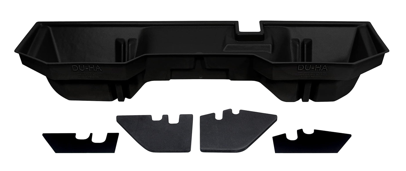 Q: How does the DÜHA Under Seat Storage System enhance organization in my truck?A: This under seat storage system features a durable, heavy-duty construction and includes an easily removable two-piece rack/organizer that helps to separate items, keeping your truck cab organized. The ability to remove dividers also allows for the storage of larger items, maximizing the use of available space.