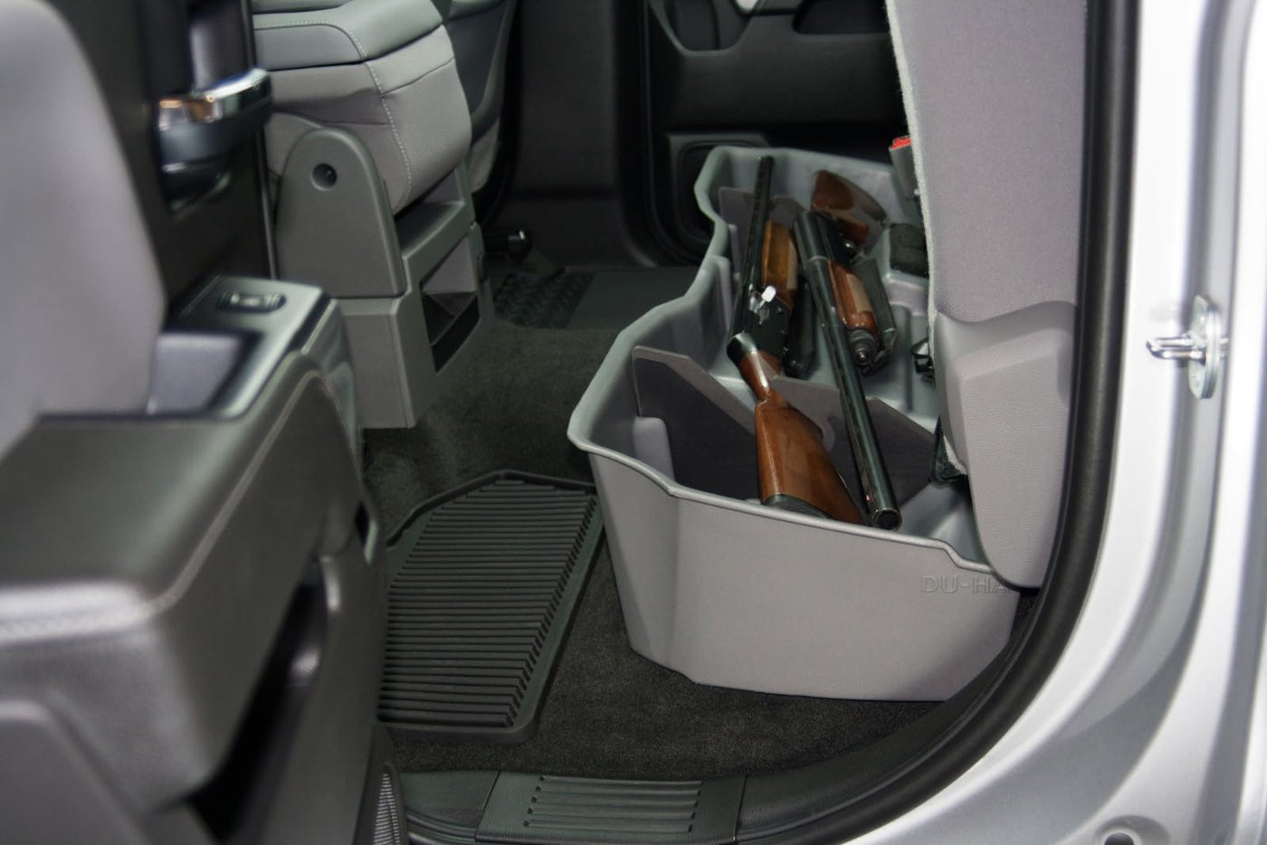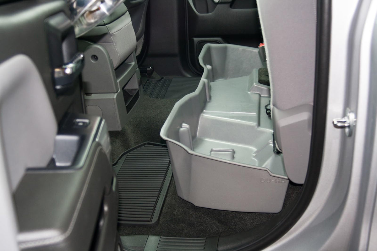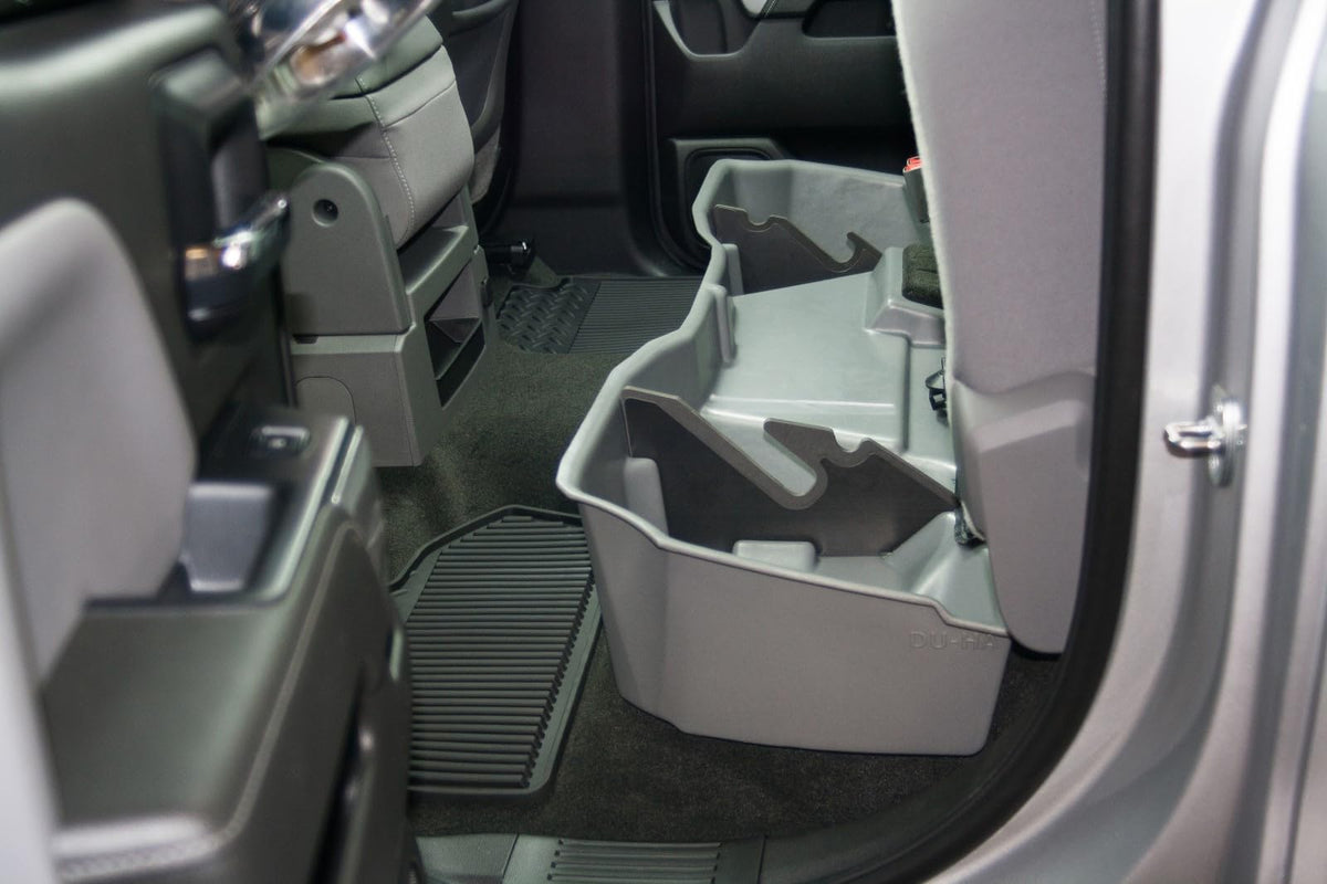 DU-HA Storage Systems - Whether you're a contractor, sportsman or simply someone looking for a great way to organize your pickup truck and keep your gear safe and out of sight, the DU-HA is perfect for you. The DU-HA allows you to store your gear, guns, power tools, tow ropes, tie down straps, first aid kit, tackle, bungee straps, hats, boots, gloves, chains, jumper cables, and so much more safely and securely under or behind the back seat of your truck. The DU-HA includes a 2 piece gun rack/organizer, so you can safely store your guns in their upright position. The organizers/gun racks are easily removable so you can store larger items if you’d like. The DU-HA acts as a legal gun case in most states and carries 2-4 guns depending on the model of your truck. Most DU-HA’s can be installed quickly and easily in under 10 minutes. Many models are available in matching interior colors, so the Du-HA will blend in seamlessly with your trucks interior and have a factory feel. The DU-HA is constructed from heavy duty polyethylene, is Made in the USA, and has a lifetime warranty. **IMPORTANT Fitment info – Fits 14-17 Chevy/GMC Silverado/Sierra Double Cab. Using a tape measure, measure directly under the back door handle across the width of the door. If it measures 30-1/2” wide, you have a Double Cab. If your back door measures 40” wide, you have a Crew Cab. Please be sure to specify your year/make/model vehicle using the “Find Parts” at the top of the product page to make sure it fits **