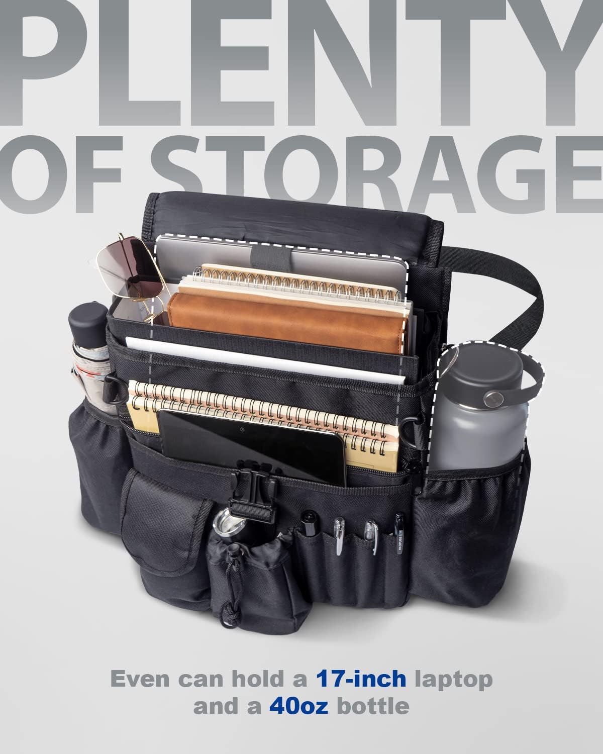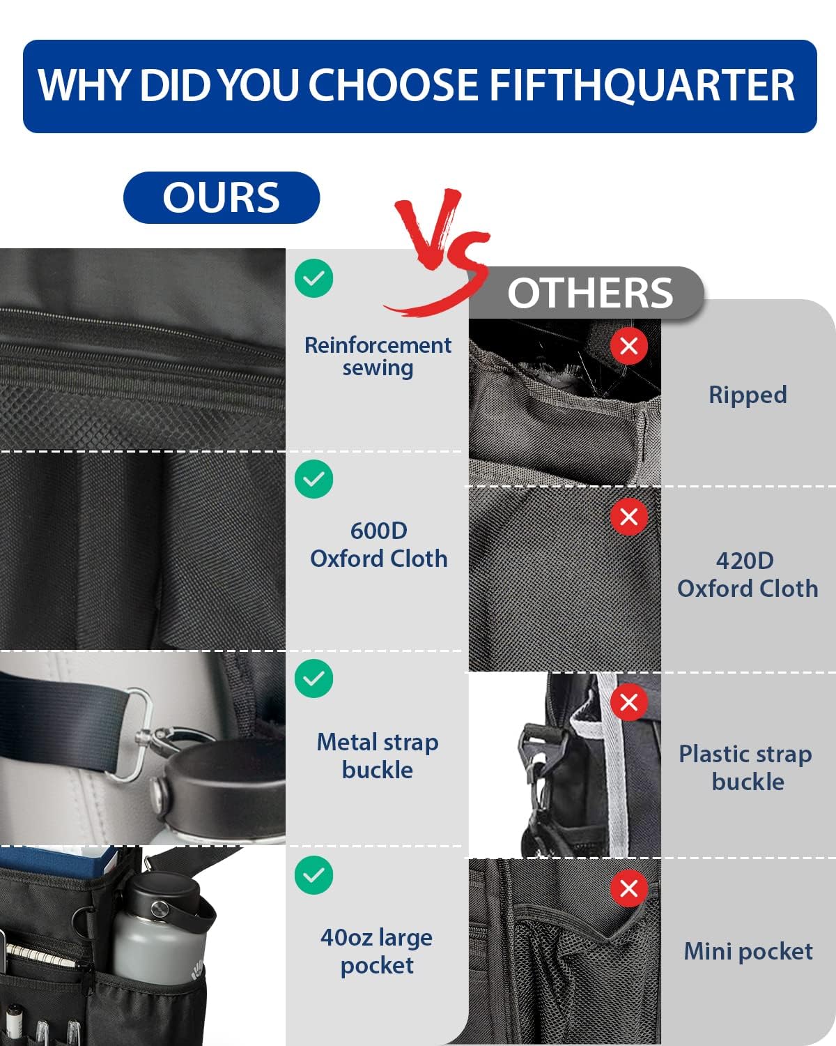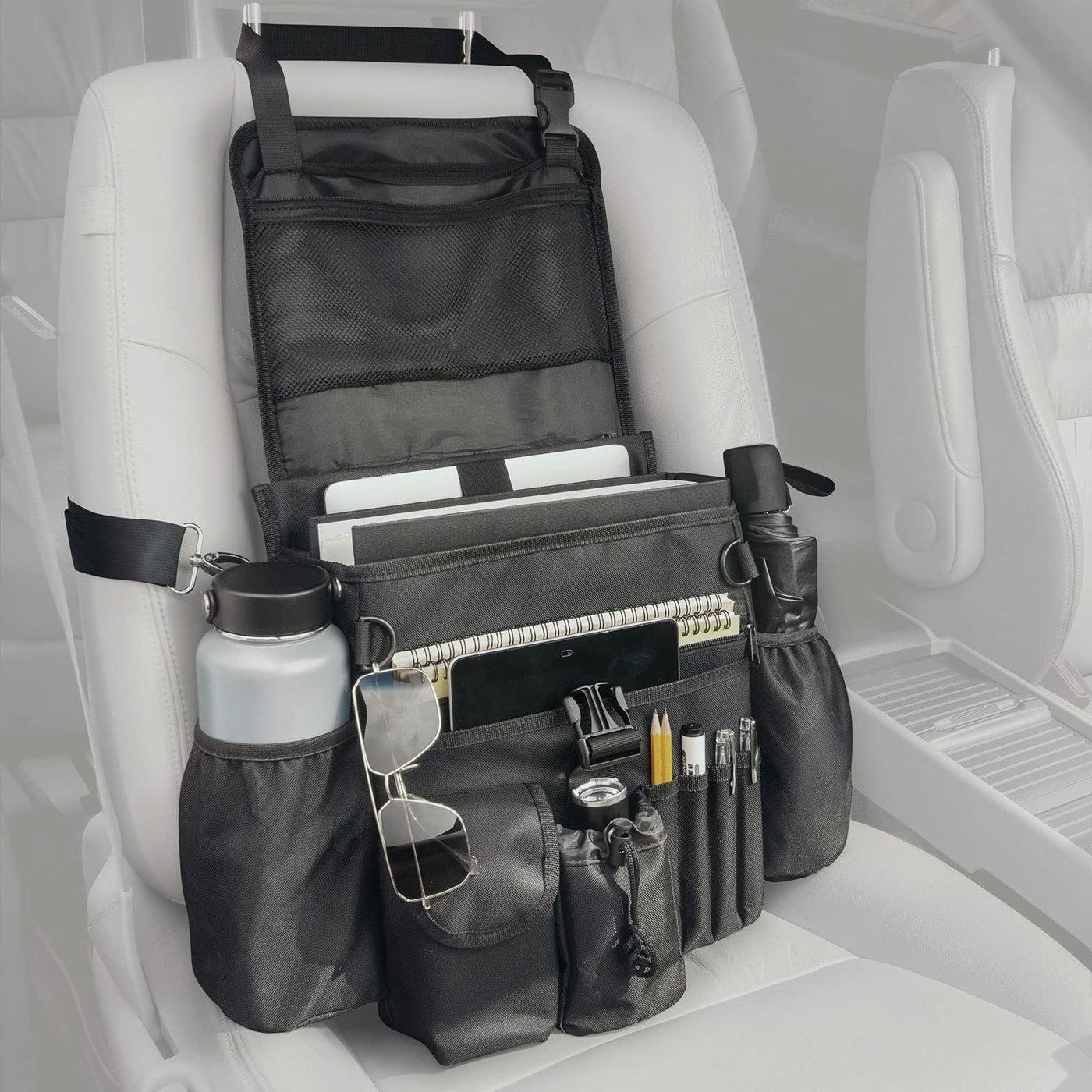 Have you ever experienced a similar situation? Are you frustrated by the messy front seat? Does anything roll around and sliding into the floor in your car while driving? Do you need to spend 15 minutes or more to clean up the front seat when someone joins you? Our portable seat organizer keeps everything organized, and easy to access. When someone wants to join you somewhere, you just spin it around so it is hanging in the back. Cover design, protect your things and privacy. Adjustable shoulder strap, portability and stability coexist. Built-in laptop compartment, perfectly hold a laptop within 17 inches D-ring, Hang anything you need. Enlarge side pockets, meet your water needs. If you are the police, commuter, guard, cop, or commander, FifthQuarter car seat organizer can help you. You can easily organize your stuff, such as a flashlight, laptop, umbrella, pen, key, and other tools. If you are the mom, salesman, nurse, or paperwork. FifthQuarter car storage organizer can help you. You can easily organize your paper, notebook, note, books, luggage, atlas, pens, document, and other supplies. If you are the drivers or truckers. FifthQuarter car trunk front and back seat organizers and storage can help you. You can easily organize your laptop, tools, notebook, and other things.