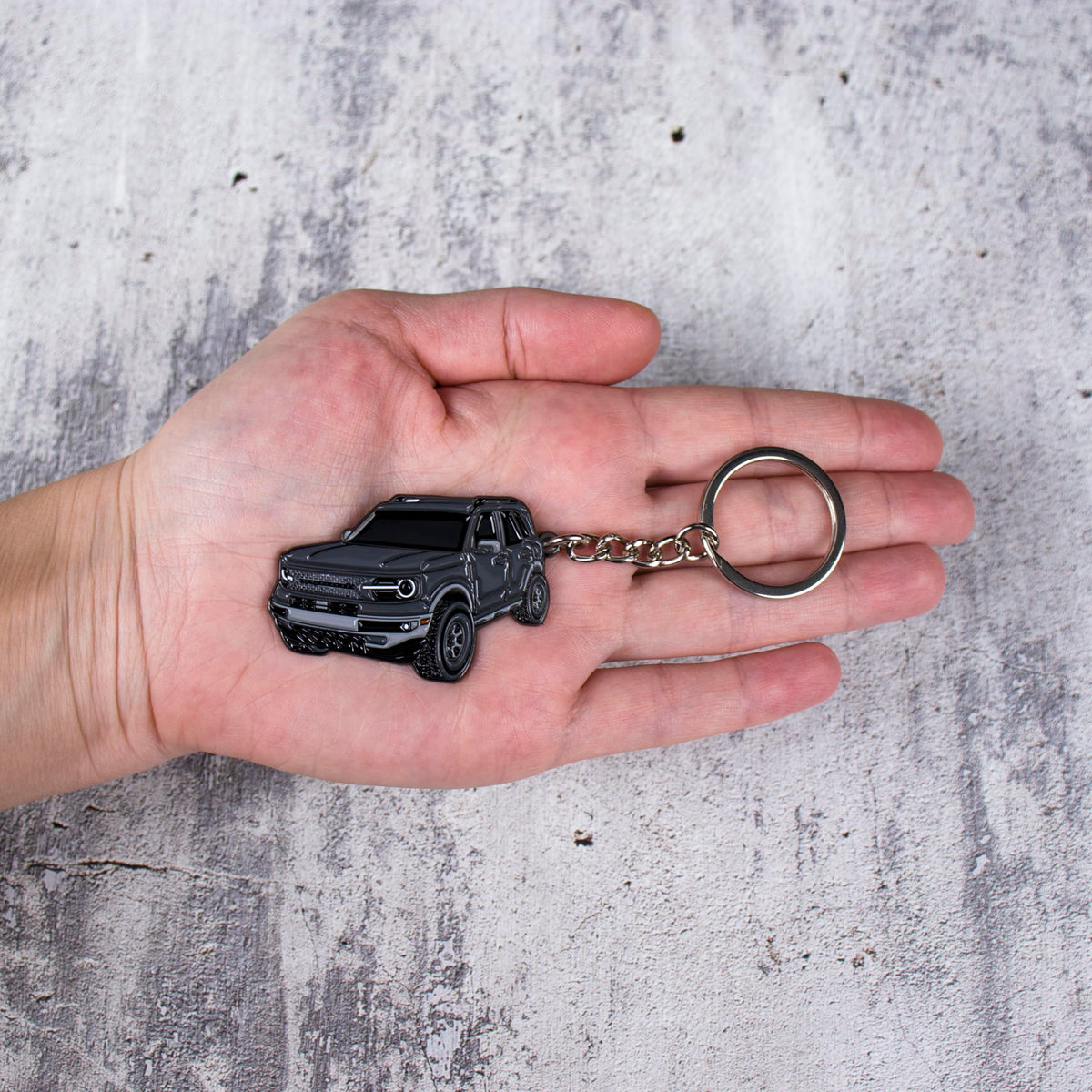 Q: What sizes does the Bronco Sport Keychain come in?A: The Bronco Sport Keychain measures 2 inches by 1.3 inches, making it the perfect size to attach to your keys without being too bulky.