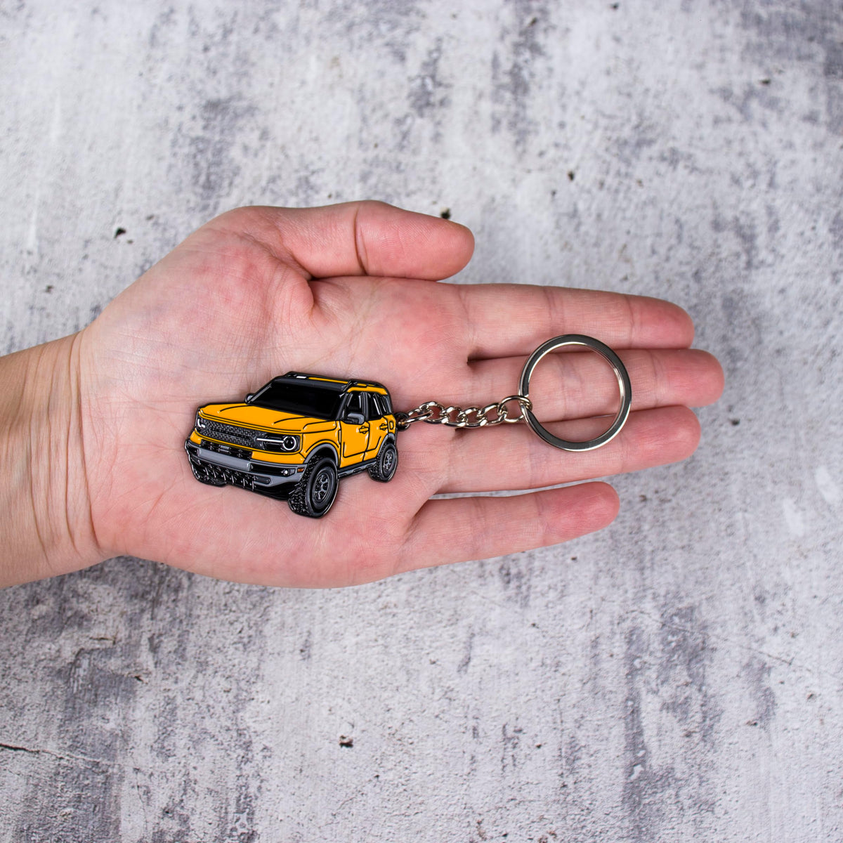 Q: What materials are used in the construction of the Bronco Sport Keychain?A: The Bronco Sport Keychain is made from sturdy metal and enamel, providing a durable yet lightweight accessory that enhances your Bronco experience.