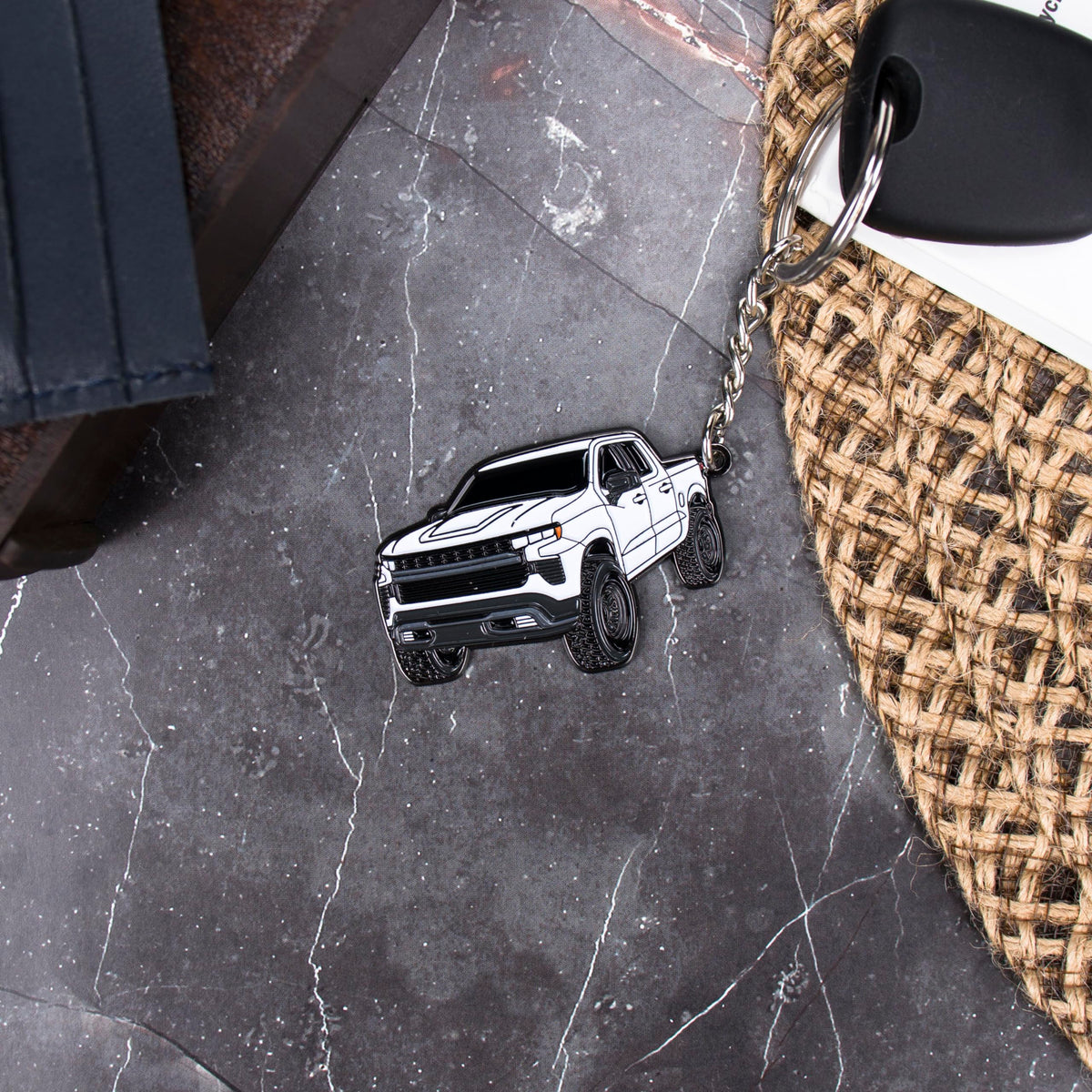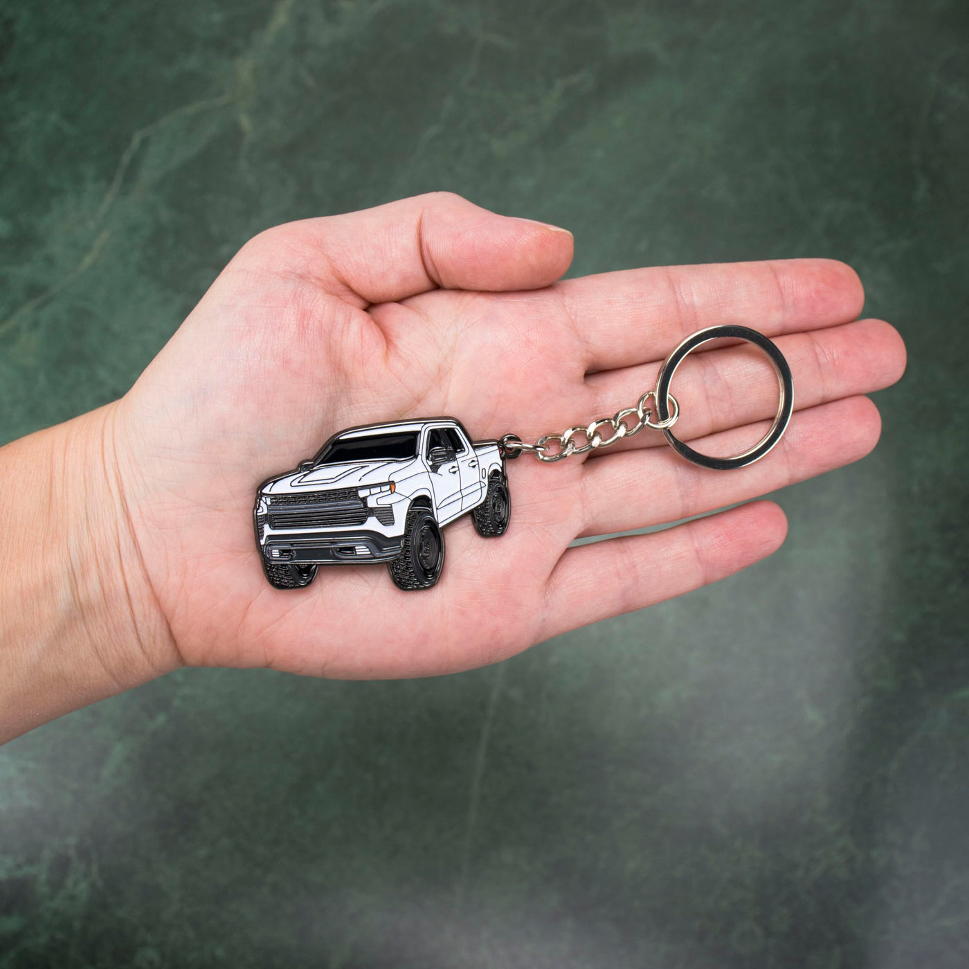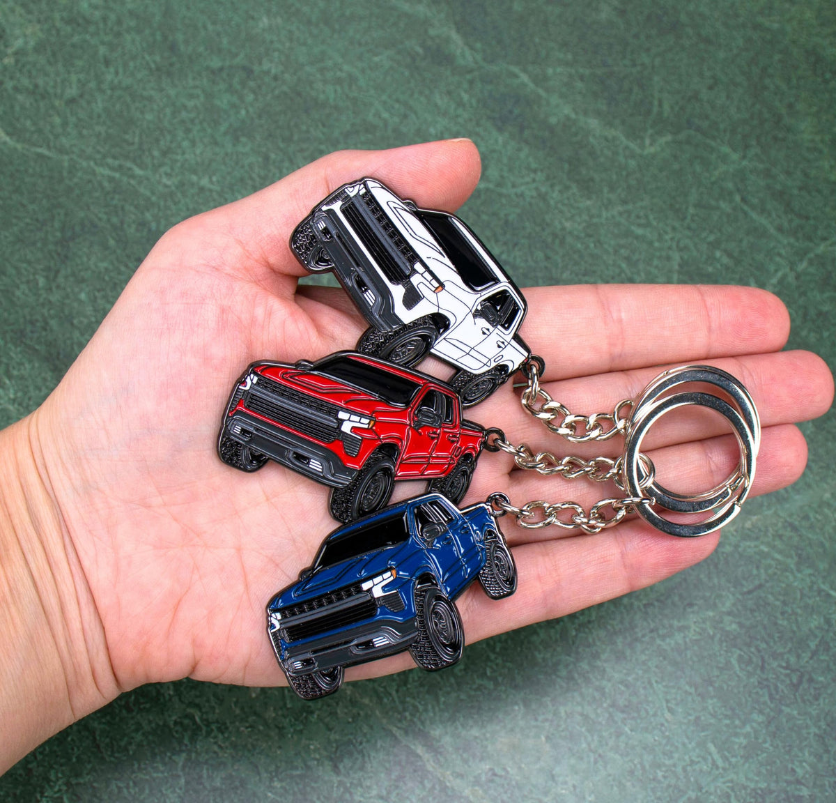 KEYCHAINS compatible with Chevy Silverado Our keychain is a great addition to your chevy assesories and toy truck collection. VARIOUS COLORS KEYCHAINS that fit every model color: - Black- White- Silver- North Sky Blue- Glacier Blue- Sand Dune- Dark Gray- Red Chevy TOY TRUCKMATERIAL: metal/enamel. Very sturdy but lightweight. PERFECT GIFT for any Chevy owner. DETAILED COPYRIGHTED DESIGN by our talented artist.