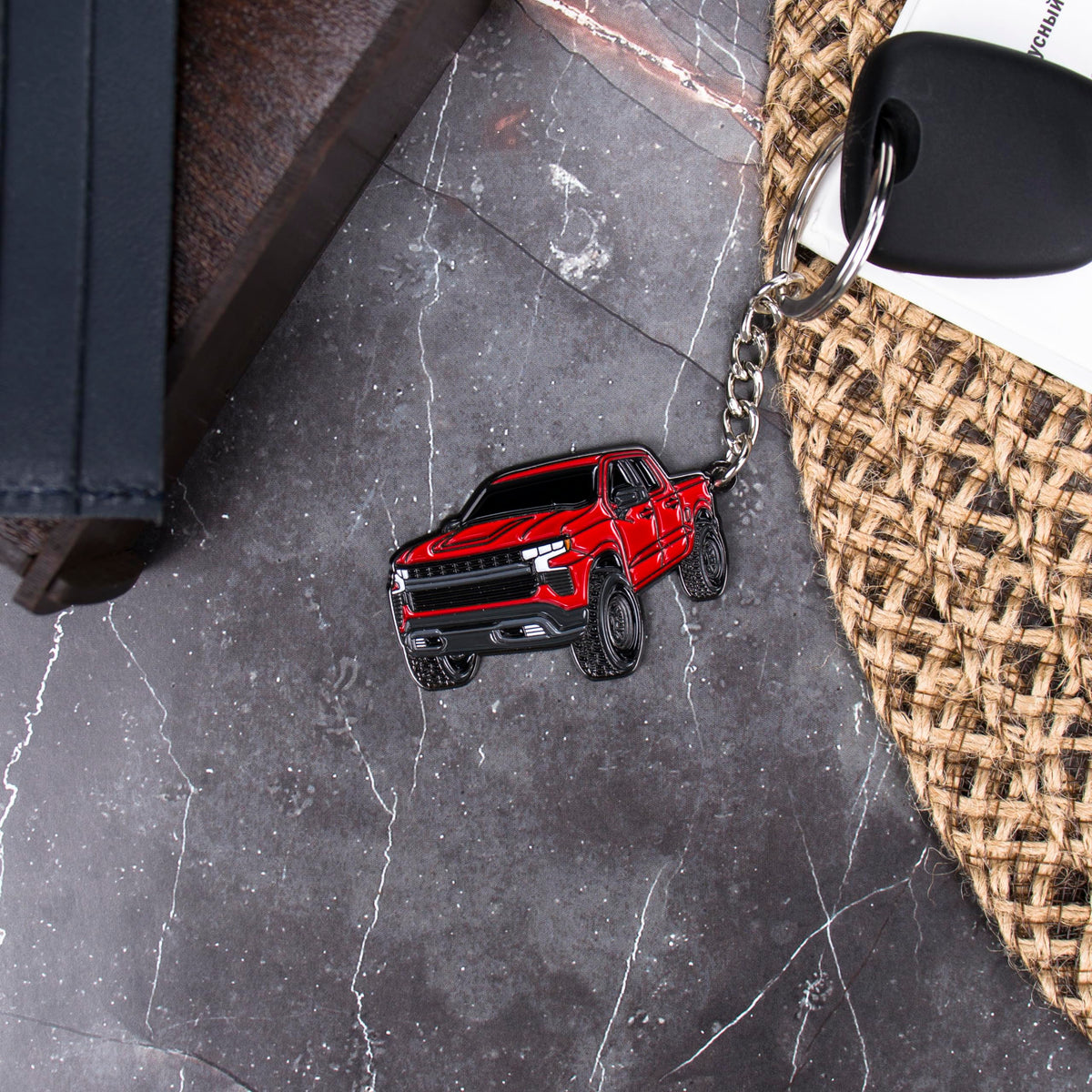 KEYCHAINS compatible with Chevy Silverado Our keychain is a great addition to your chevy assesories and toy truck collection. VARIOUS COLORS KEYCHAINS that fit every model color: - Black- White- Silver- North Sky Blue- Glacier Blue- Sand Dune- Dark Gray- Red Chevy TOY TRUCKMATERIAL: metal/enamel. Very sturdy but lightweight. PERFECT GIFT for any Chevy owner. DETAILED COPYRIGHTED DESIGN by our talented artist.