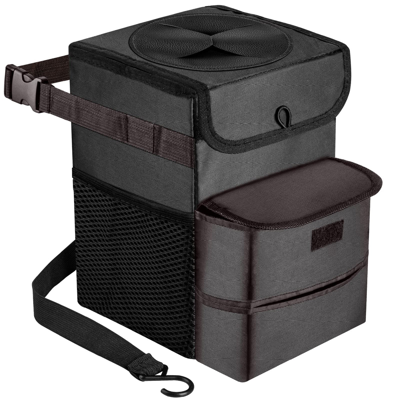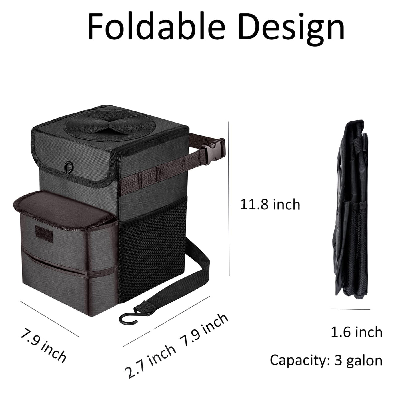 Worried about the garbage made in the car? Foldable car trash bin can solve your trouble. Three advantages: 1. Large capacity. You can throw more trash and it's foldable that doesn't take up too much room. It also as a storage bag for kid's toys, drinks and so on. Especially if you have kids or pets, you may need a more convenient trash can to simplify your daily clean work! 2. High quality material. The liners used seamless hot press technology, are 100% leakproof. The liners can clean easily. 3. Needn't to install. Just open the car trash bin and fit it to the headrest in the back of the seat, console and glove box. It can keep your car clean even in a long drive. Instruction: 1. Adjust back strap & buckle to fit where you want to fix. 2. Fasten with hook strap to the bottom of seat. Specifications: Color: Black + Blue Open Size: Approx. 7.9''L x 11.8''H x 7.9''W Folding Size: Approx. 7.9''L x 11.8''H x 1.6''W Outer Material: Nylon Inner Material: Waterproof Vinyl Notice: 1. Please allow 0.4''-0.8'' error due to manual measurement. 2. Washing Method: recommend hand wash with soap and soft wipers or brushes.