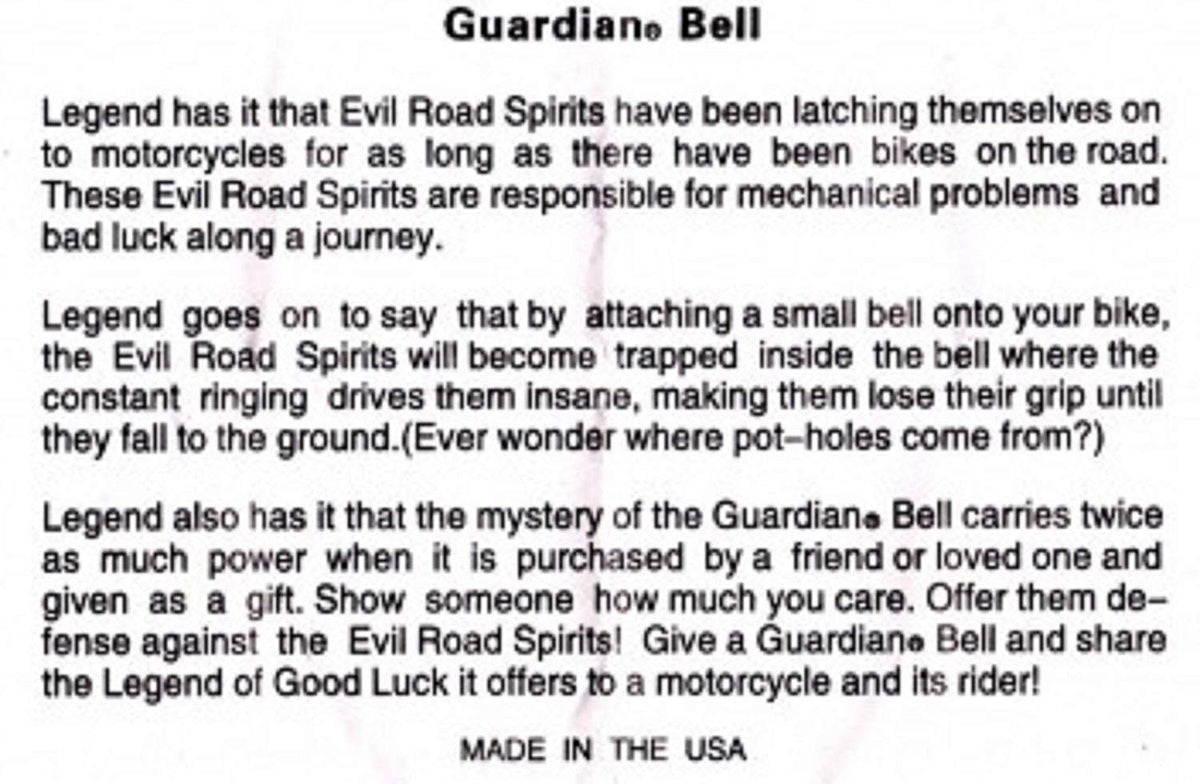 Legend Has It That Evil Road Spirits Have Been Latching Themselves On To Motorcycles For As Long As There Have Been Bikes On The Road. These Evil Road Spirits Are Responsible For Mechanical Problems And Bad Luck Along A Journey. Legend Goes On To Say That By Attaching A Small Bell Onto Your Bike, The Evil Road Spirits Will Become Trapped Inside The Bell Where The Constant Ringing Drives Them Insane, Making Them Lose Their Grip Until They Fall To The Ground. (Ever Wonder Where Potholes Come From?) Legend Also Has It That The Mystery Of The Guardian Bell Carries Twice As Much Power When It Is Purchased By A Friend Or Loved One And Given As A Gift. Show Someone How Much You Care. Offer Them Defense Against The Evil Road Spirits! Give A Guardian Bell And Share The Legend Of Good Luck It Offers To A Motorcycle And Its Rider!