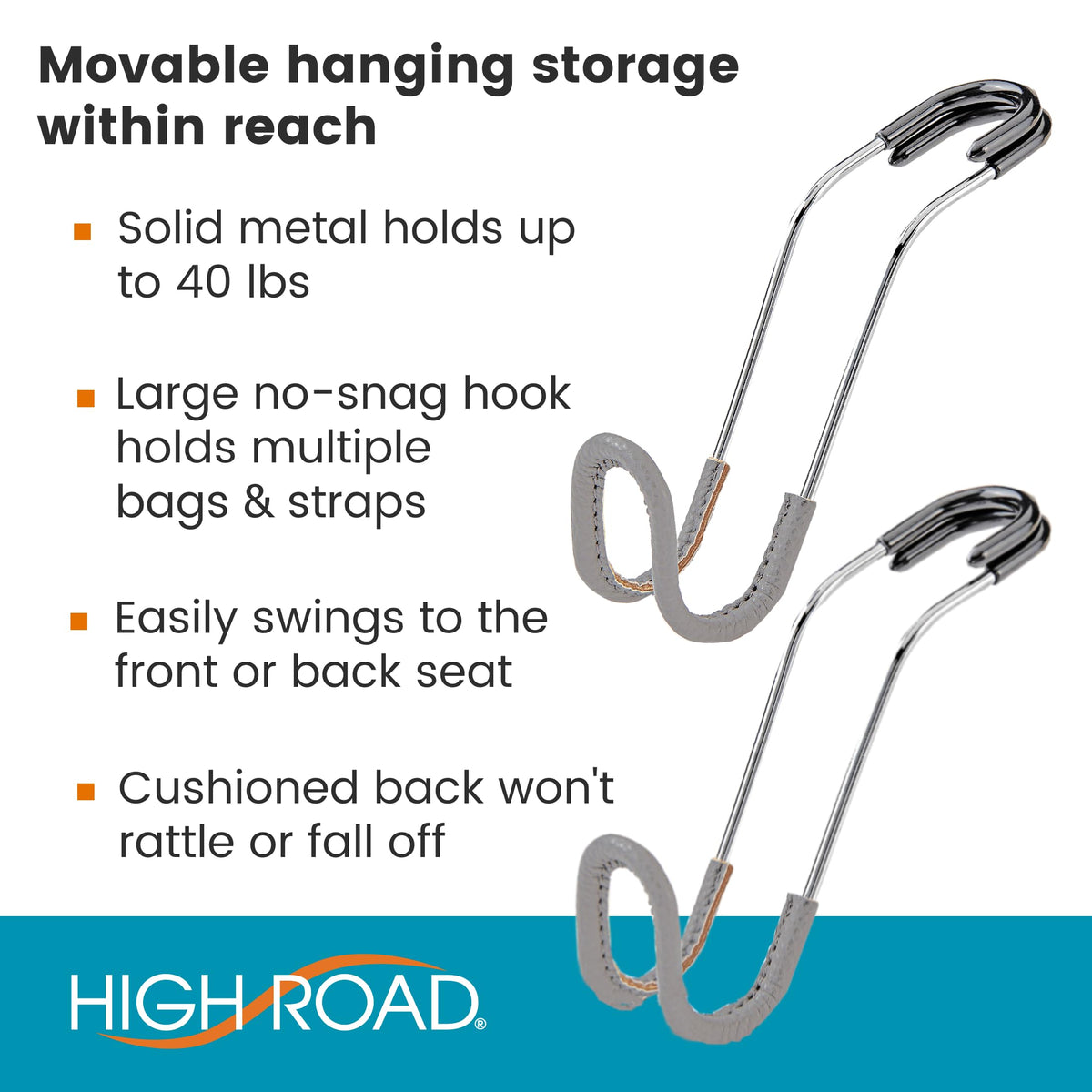 Car, truck and SUV accessories that offer hanging car storage and organization off the car seat and floor. Use as a purse hook for car, a hard hat holder for truck or a car umbrella holder. High Road car hooks have many uses as versatile car gadgets for work, camping, road trip essentials, and van life accessories and make a perfect gift for men and women.
