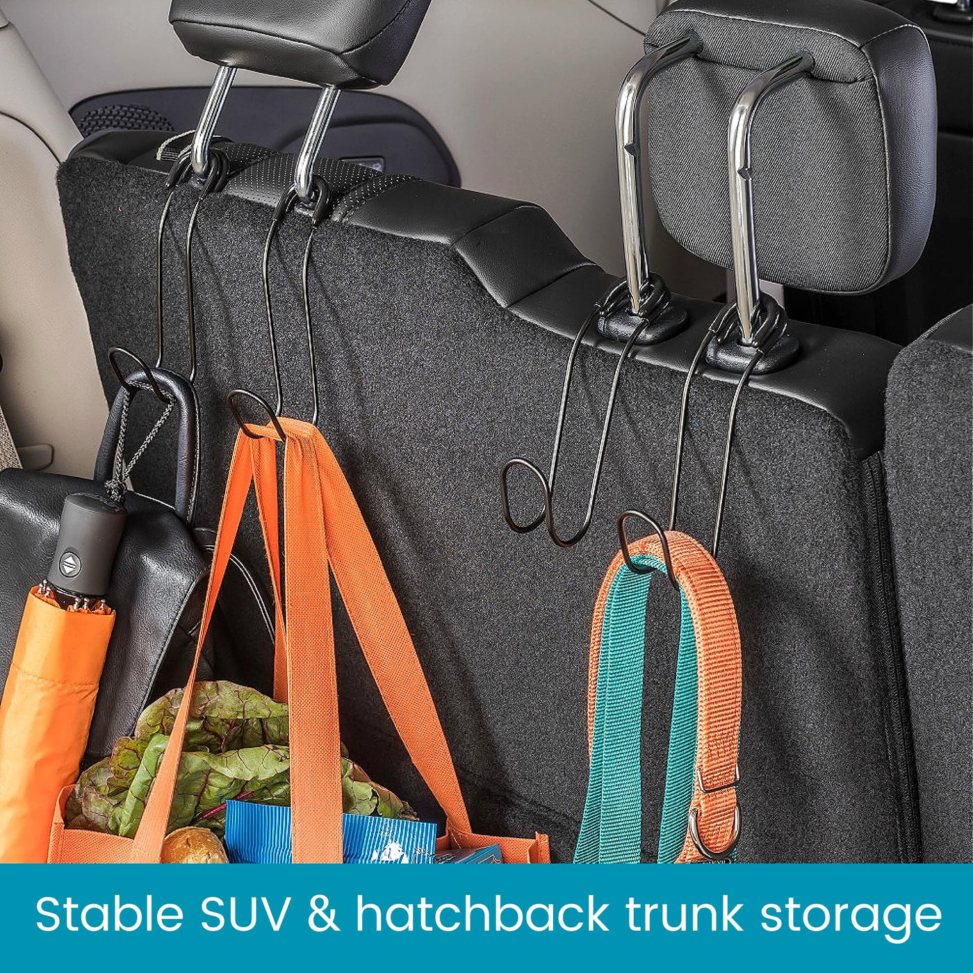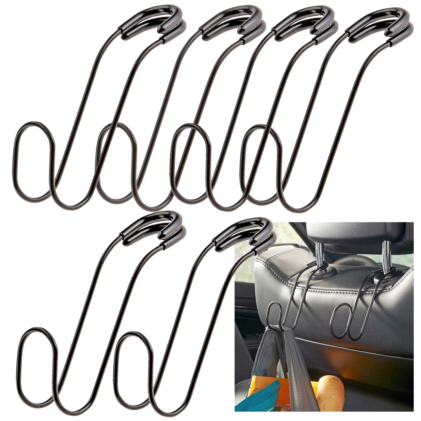 Automotive seat back organizers that add instant car hanging storage to any vehicle. A car hook, car seat hook, car bag holder, car purse holder, car hard hat holder and more. Set of 6 car hooks for headrest can be used to hang work and van supplies.