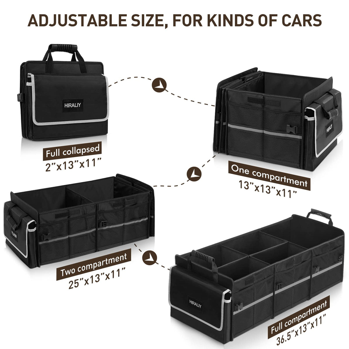 Q: Can I fold the trunk organizer when it's not in use?A: Absolutely! The HIRALIY trunk organizer is foldable and can be compactly stored, reducing space when not in use, similar in size to an ordinary laptop bag.