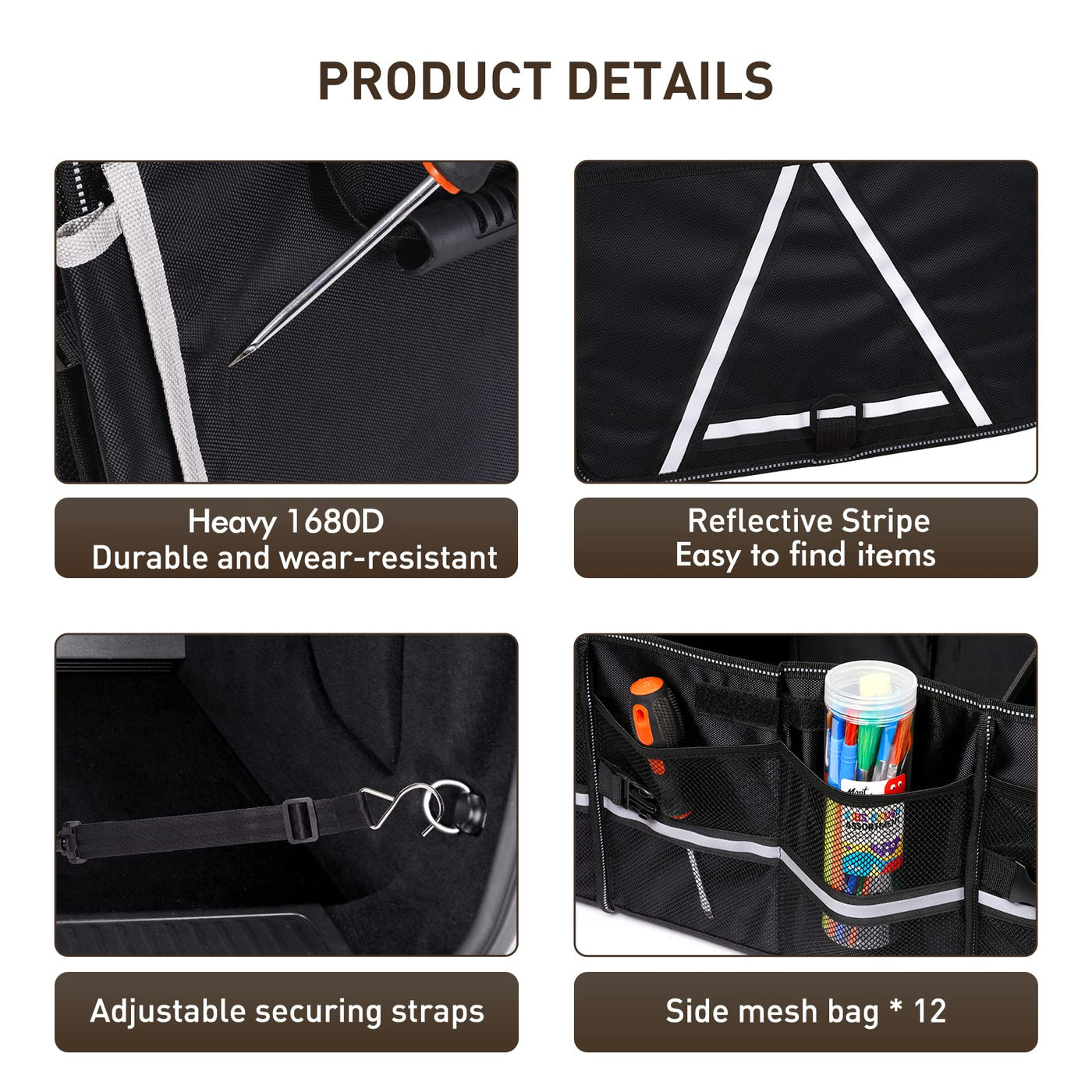 Q: Does the trunk organizer have features for nighttime visibility?A: Yes, the trunk organizer is equipped with reflective stripes for enhanced visibility at night, making it easier to locate in low-light conditions.
