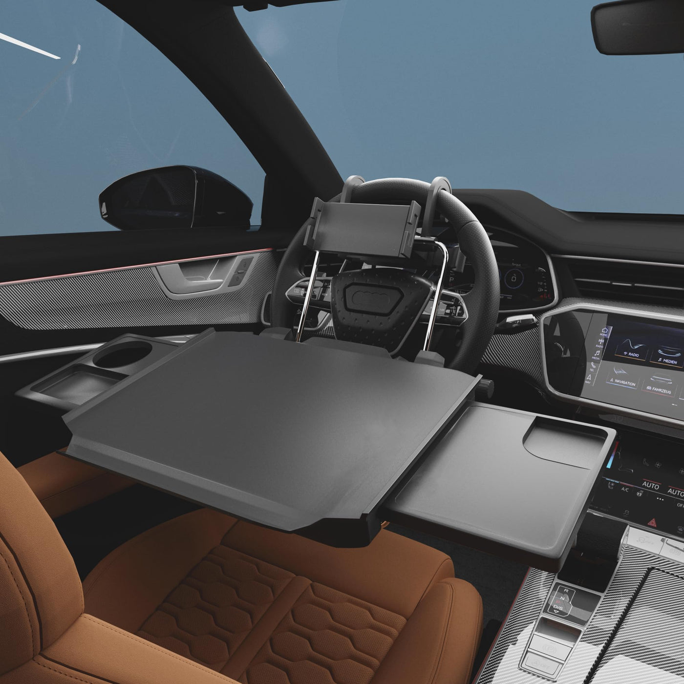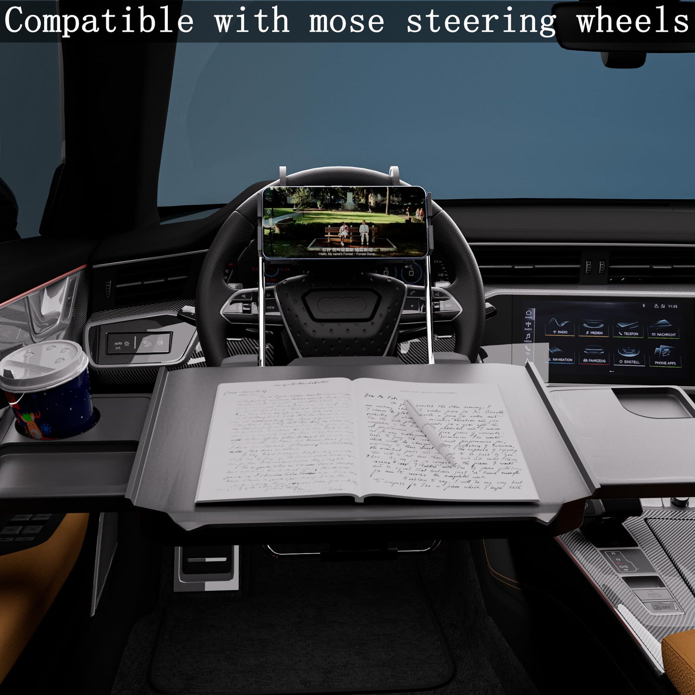 Multifunctional Steering Wheel Tray: The car steering wheel tray can be used as a tray for meals and drinks, allowing you to conveniently enjoy food in your car. It also serves as a laptop desk, providing a stable platform for mobile work or studying. It meets various in-car activity needs. Wide Compatibility: The steering wheel tray features a spacious main surface measuring 18.8 inches. With the extended car tray, it can accommodate laptops larger than 19 inches. It is compatible with most circular steering wheels, making it suitable for sedans, SUVs, and business vehicles. Premium Materials: Made from high-quality ABS plastic or high-strength composite materials, the tray is wear-resistant, impact-resistant, and durable for long-term use. Its sturdy construction can support heavy loads (up to 30 pounds) without deforming or sliding, ensuring safe usage. The smooth, waterproof, and stain-resistant surface makes cleaning effortless-simply wipe it clean. Even with food or drinks, theres no need to worry about residue or spills. Easy Adjustment and Storage: The car desk features two adjustment knobs on the top and bottom. The upper knob adjusts the desk 's height, while the lower knob modifies the desks tilt angle, providing an ideal fit and maximum comfort. Designed with portability in mind, the lightweight tray is easy to carry or store in your car. After use, it can be quickly detached and stored in the trunk, behind a seat, or in storage compartments, taking up minimal space. The Perfect Gift for Drivers: Ideal for long drives, travel breaks, or temporary work, the steering wheel tray enhances comfort and convenience for drivers and passengers during trips. It satisfies multiple scenarios in one, making your in-car environment more thoughtful and efficient.