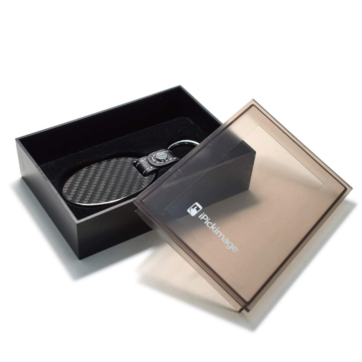 Q: What materials are used in the iPick Image Cadillac V Logo Keychain?A: The iPick Image Cadillac V Logo Keychain is made from premium quality materials, including real black 3K carbon fiber for the keychain body and a soft black leather strap for comfort and style.