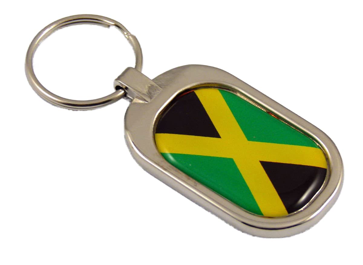 Q: What material is the Jamaica Flag Key Chain made of?A: The Jamaica Flag Key Chain is made of durable metal with a chrome plating that provides a sleek and shiny finish.