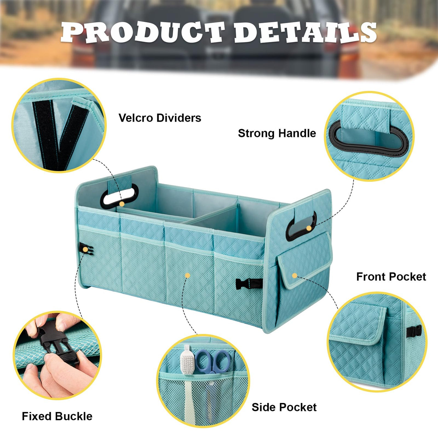 Use our car stuff can keep all your auto traveling essentials neatly organized in one place and save yourself time. Use our car caddy bag you will never have to scramble around a messy car looking for a lost cellphone, baby cute toy, pet supply, sports things, grocery, magazine, etc. Features and Benefits ? Cargo Basket has 3 adjustable modes. It can be used as 1, 2 or 3 compartment depends on your space, store All Your Essentials! ? 4 Mesh Pockets, 2 front and rear pockets can hold your small item, bottle, keys, kids books, diaper, girls products, tools, phone, purse. ? Car tote bag with 2 Heavy-Duty Carrying Handles, Strong, non-slip comfortable, heavy-duty handles with grips to allow for easy transport. ? The Truck Bed Organizer has Multiple convenient compartments and pockets allow for easy access to your belongings. Easily hold anything you can think of! ? Fabric- Double thread stitching that will last you a long time use. ? Water and abrasion-resistant materials- Waterproof lining for easy cleaning. ? Sturdy sidewalls and a center divider to hold your organizer open and give strength even when empty. ? Folds down to retain half of the storage space and can be used as a shopping cart, car backseat or front seat console storage. ? Easy to use and carry: this storage bins can be folded to flat, room-saving when not in use. Car must haves. ? Simple and fashionable diamond-shaped lattice appearance design, three-dimensional sense of strong, aesthetic, is the perfect car decoration ? Fits all vehicles (truck, Jeep, Suv, Van, sedan) ? Can also be used in garages, closets, offices, camping, golf Specification Color: Pink, Beige, Black, Dark Blue, Lake Blue, Light Purple, Red, Light Grey, Black Floral Size: L 22 x W 12.5 x H 10.8 (56cm x 32cm x 27.5cm) Material: 600D Oxford Weight: 2.62lb/1.19kg Package Include 1* car trunk organizer
