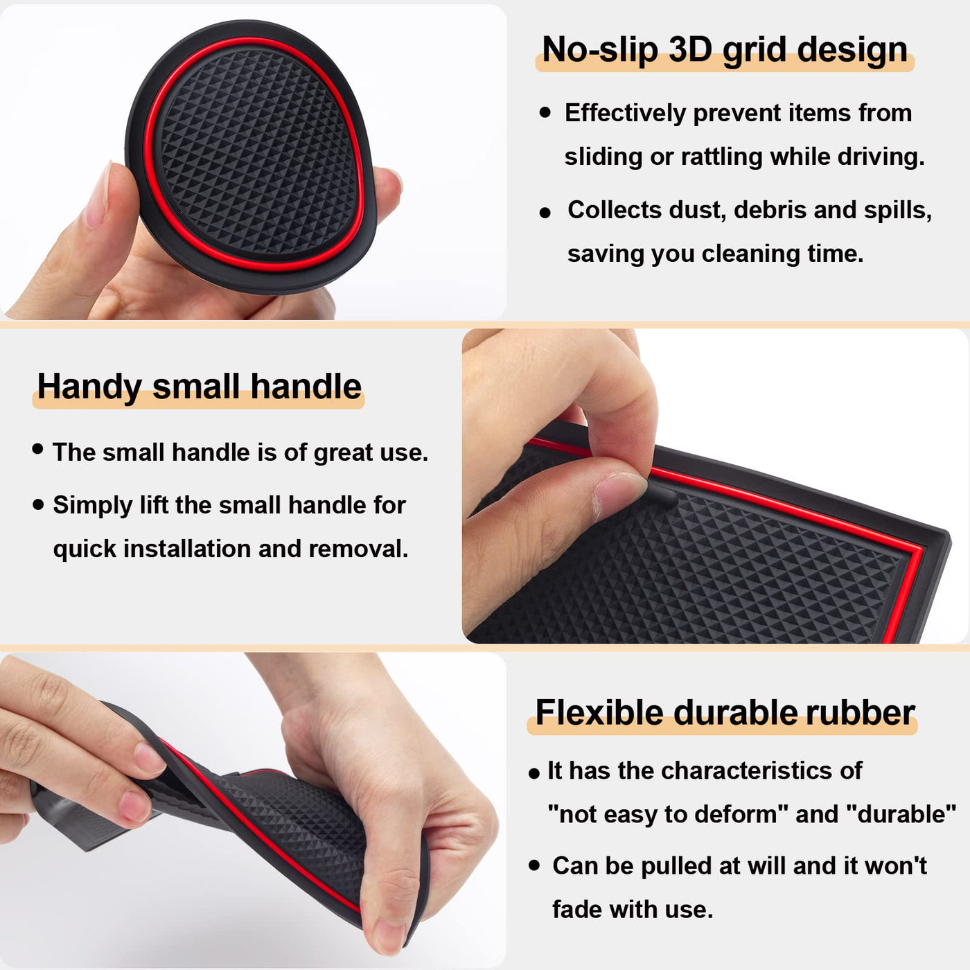 Q: How do the anti-skid features of these mats work?A: These mats have a specially designed 3D grid surface that effectively prevents items from sliding or rattling during driving, ensuring that your belongings stay in place.