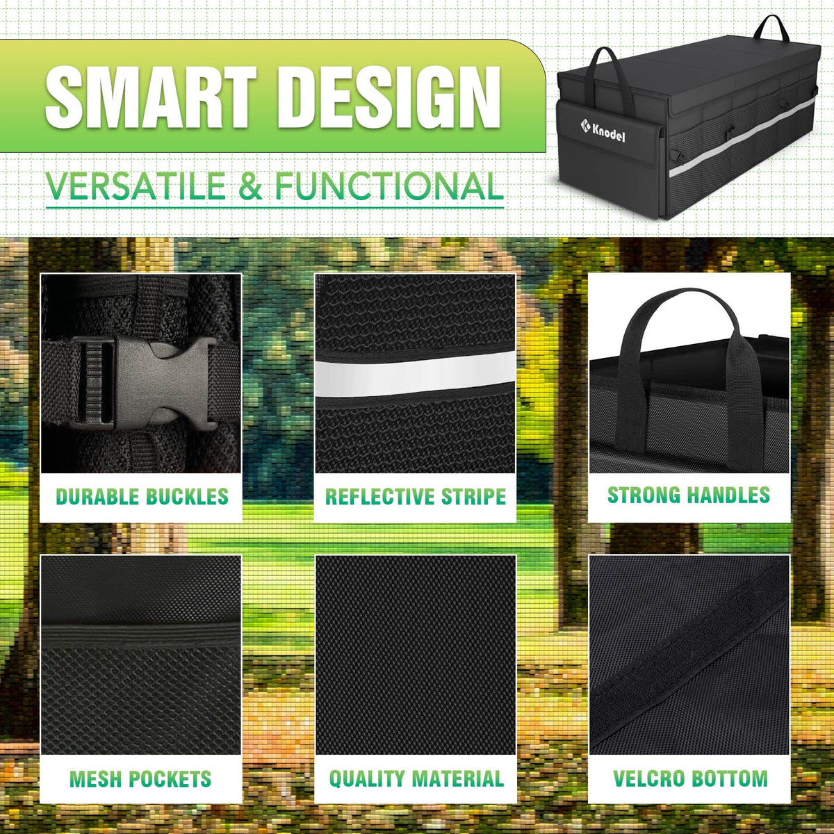Premium Car Trunk Organizer: The K Knodel Trunk Organizer Is Best For All Kinds Of Vehicles. Due To Its Large Storage Capacity, It Keeps Everything Organized While Giving You A Clean And Tidy Car. It Can Also Be An Ideal Storage Basket For Household Usage. Its Reflective Stripe Makes It More Secure When You Are Carrying It At Night. | Durability And High Quality: The K Knodel Trunk Organizer Is Made Of High-Quality 600D Oxford Polyester Material With Reinforced Handles, Which Can Withstand The Weight Of Heavy Items, And Will Last You Through Years Of Repeated Use. In Addition, Our Product Features A Non-Slip Bottom To Prevent Sliding. | Smart Multipurpose Design: Our Product Features Sturdy Walls, 1 Base Plates And 1 Slider Dividers. With 3 Divided Sections, You Can Use One Or Expand It To Use Simple, Both Or All, Depending On Your Preference. The 1 Removable Divider Help You Organize Differently Sized Items, And The 6 Mesh Pockets Are Designed To Store Smaller Items. In Order To Enhance Your Organization Efforts, We Also Designed 3 Side Pockets For You For Quick Access. It Also Has A Sturdy And Foldable Cover. | Easy To Use Install And Clean: It Is Really Easy To Install And Collapse This Cargo Storage Bag. If You Are No Longer Using It, You Can Fully Fold It And It Will Occupy Less Space. If You Want To Clean It, Just Wipe Its Surface With A Wet Cloth. | Friendly Customer Service: We Are Dedicated To Providing Our Customers With Well-Made Products And Exquisite Packaging And Super Service. A Good Choice For Your Family, Friends, Classmates And Yourself.
