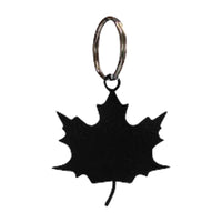 Q: What materials are used in the KC-40 Maple Leaf Silhouette Keychain?A: The KC-40 Maple Leaf Silhouette Keychain is crafted from chrome finished steel for the key ring and features a stamped iron silhouette with a flat black baked-on powder metal coating for durability and aesthetic appeal.