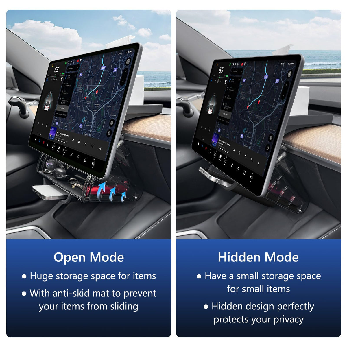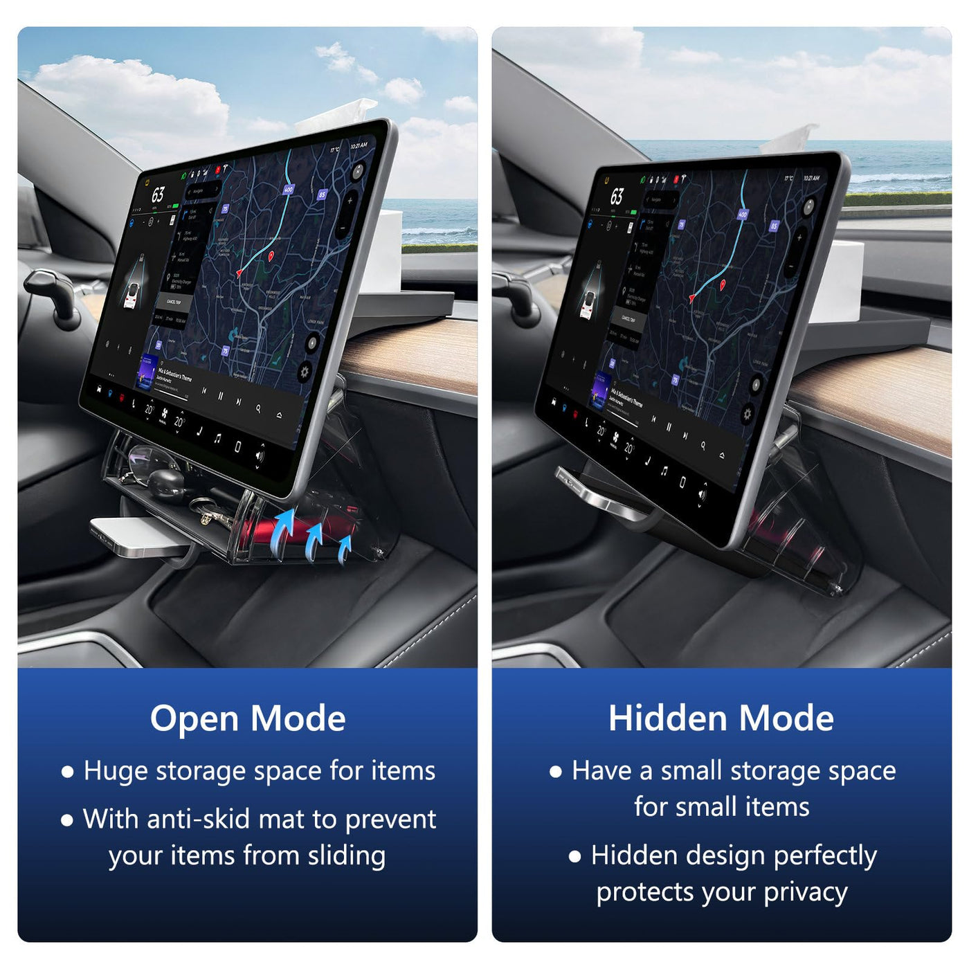 Our model 3/y Under Screen Storage Organizer (not for the 2025 Model Y Juniper and 2024 Model 3 Highland) combines a number of unique designs to provide users with an unparalleled user experience. First of all, this tissue holder for tesla adopts a convenient foldable design. After folding, it has a ''small mouth'' pocket, which can easily hold a mobile phone, greatly improving privacy and convenience. In terms of the opening and closing structure, we abandoned the common buckle limit design on the market and adopted a magnet structure instead. This not only gives the product a stronger sense of technology, but also effectively prevents the shaking noise that may be generated during use, making your experience quieter and more pleasant. In addition, behind screen tray for tesla adopts an upper and lower two-layer magnetic suction installation design. Compared with the previous generation of products, it is more ergonomic, avoids the discomfort of pushing the legs, and makes users feel more comfortable during use. Whether it is daily use or carrying out, this model y under screen organizer can bring you the ultimate convenience and comfort.