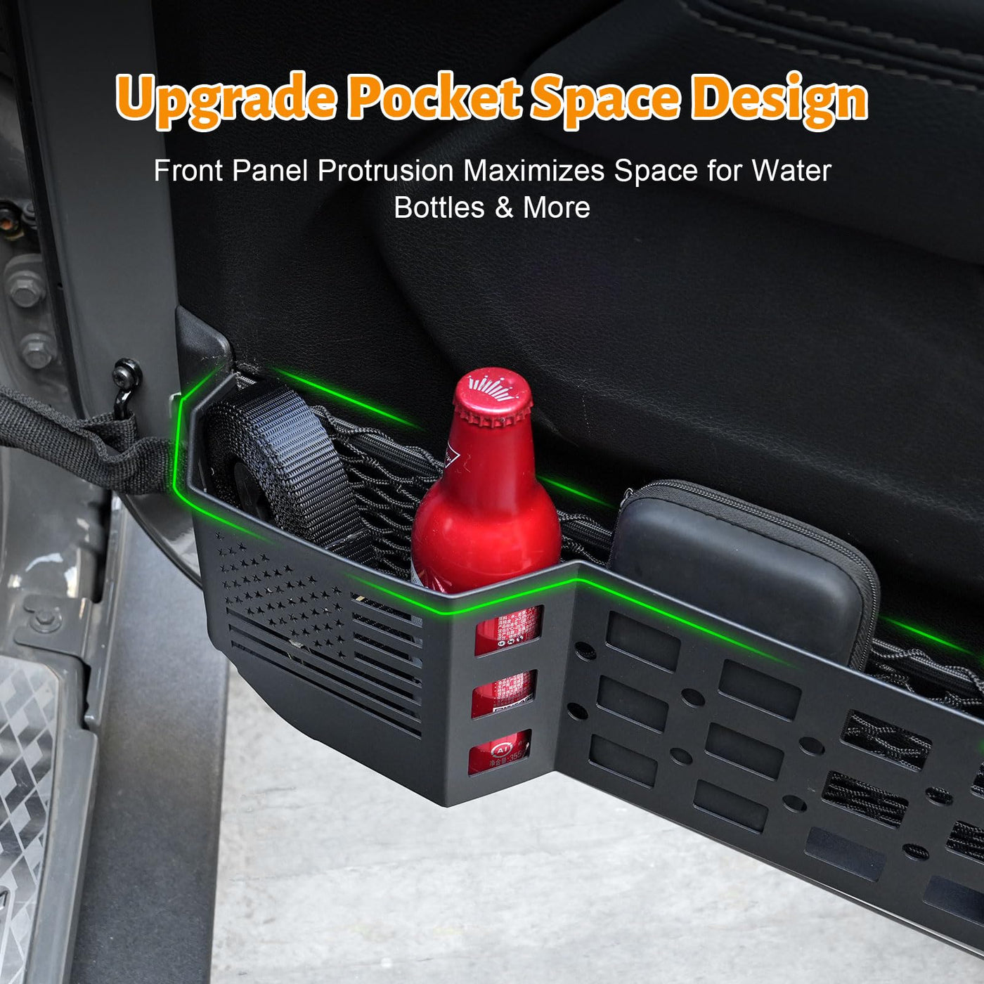 Note: Not suitable for JK/JKU models, rear doors, or vehicles with power seats. A cup holder is reserved on the passenger side for easy placement of cups or hanging of other items.The flat design on the driver's side leaves enough leg room. | ?Fitment? Ditch the flimsy OEM door nets and upgrade to our robust metal front door molle panel pockets, designed exclusively for 2018-2024 Jeep Wrangler JL JLU 4XE & 2020-2024 Gladiator JT. | ?Expanded Storage Capacity?Transform your Jeep