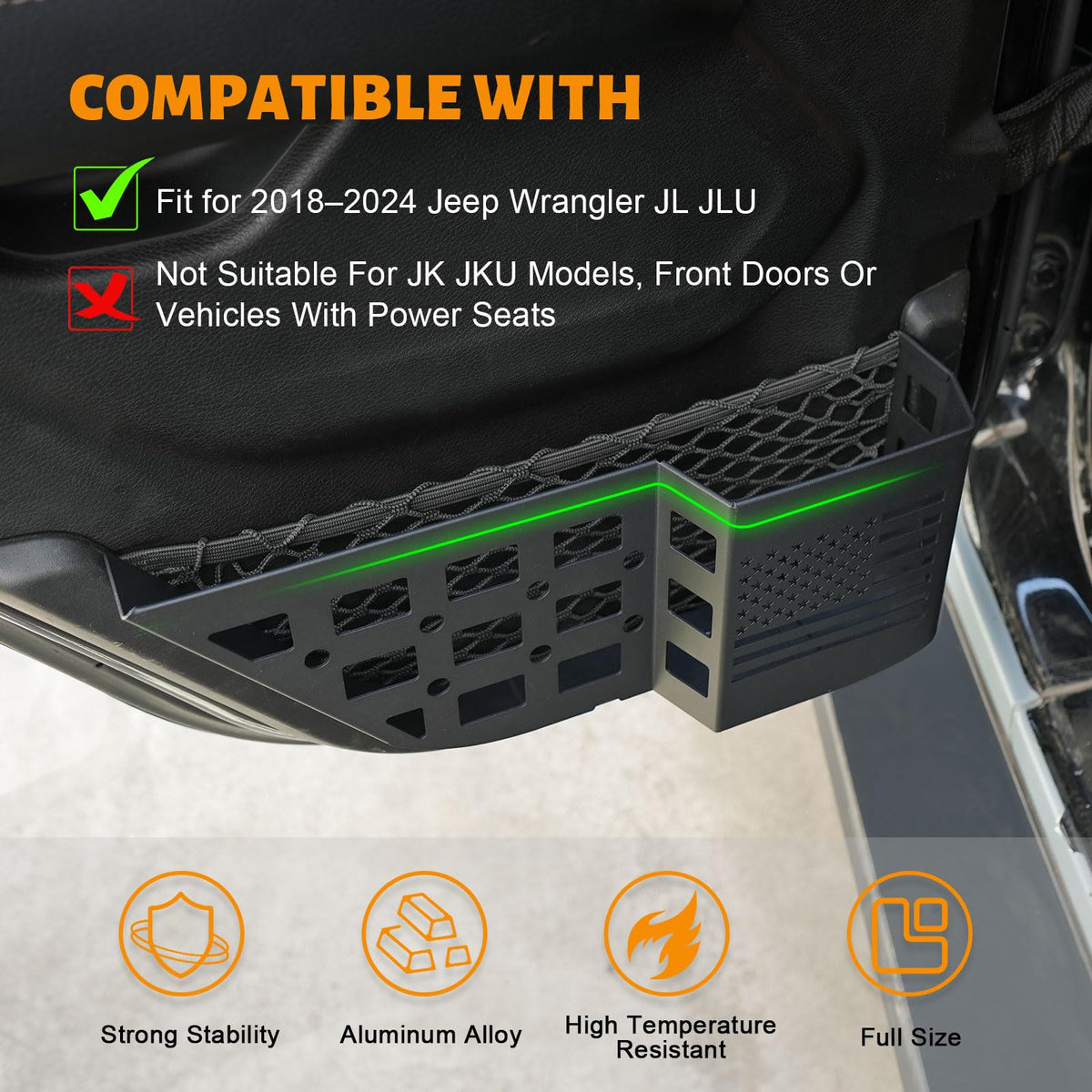 Note: Not suitable for JK/JKU models, front doors, or vehicles with power seats. | ?Fitment? Ditch the flimsy OEM door nets and upgrade to our robust metal rear door molle panel pockets, designed exclusively for Jeep Wrangler. Perfectly compatible with Jeep Wrangler JL/JLU (2018-2024), | ?Durable Premium Material? Crafted from high-quality sheet metal parts, this door storage pocket is corrosion-resistant, impact-resistant, and built to last far longer than plastic alternatives. Not only does it enhance your Jeep