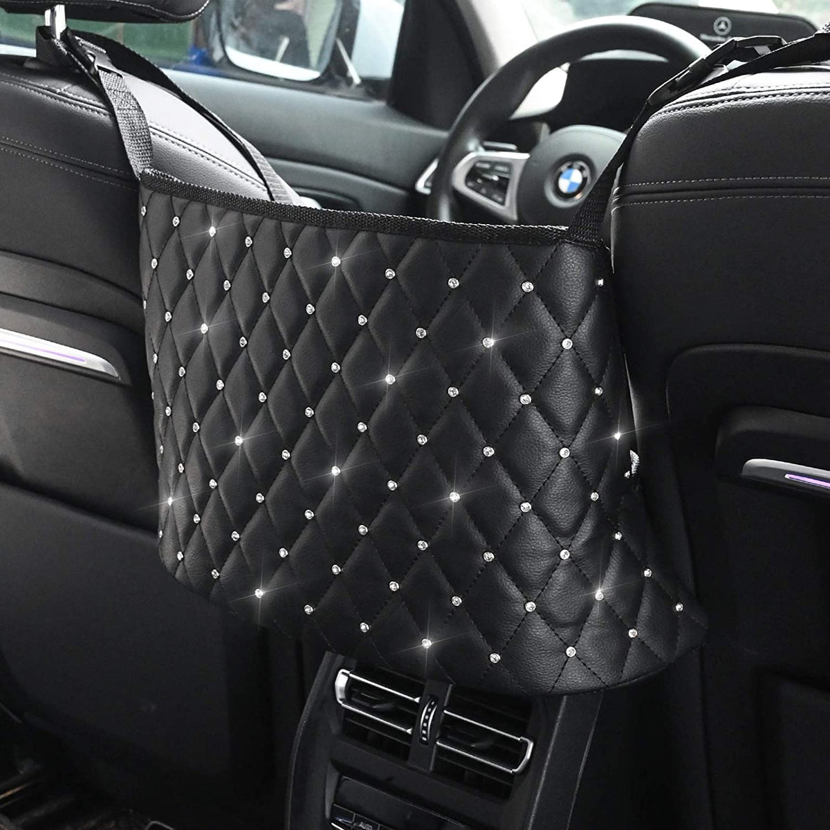 Maylai Purse Holder For Car Durable Pu Leather Car Net Pocket Car Seat Storage Net Handbag Driver Storage Netting Pouch Seat Back Net Bag Backseat Pet Kids Barrier (Black With Diamond)