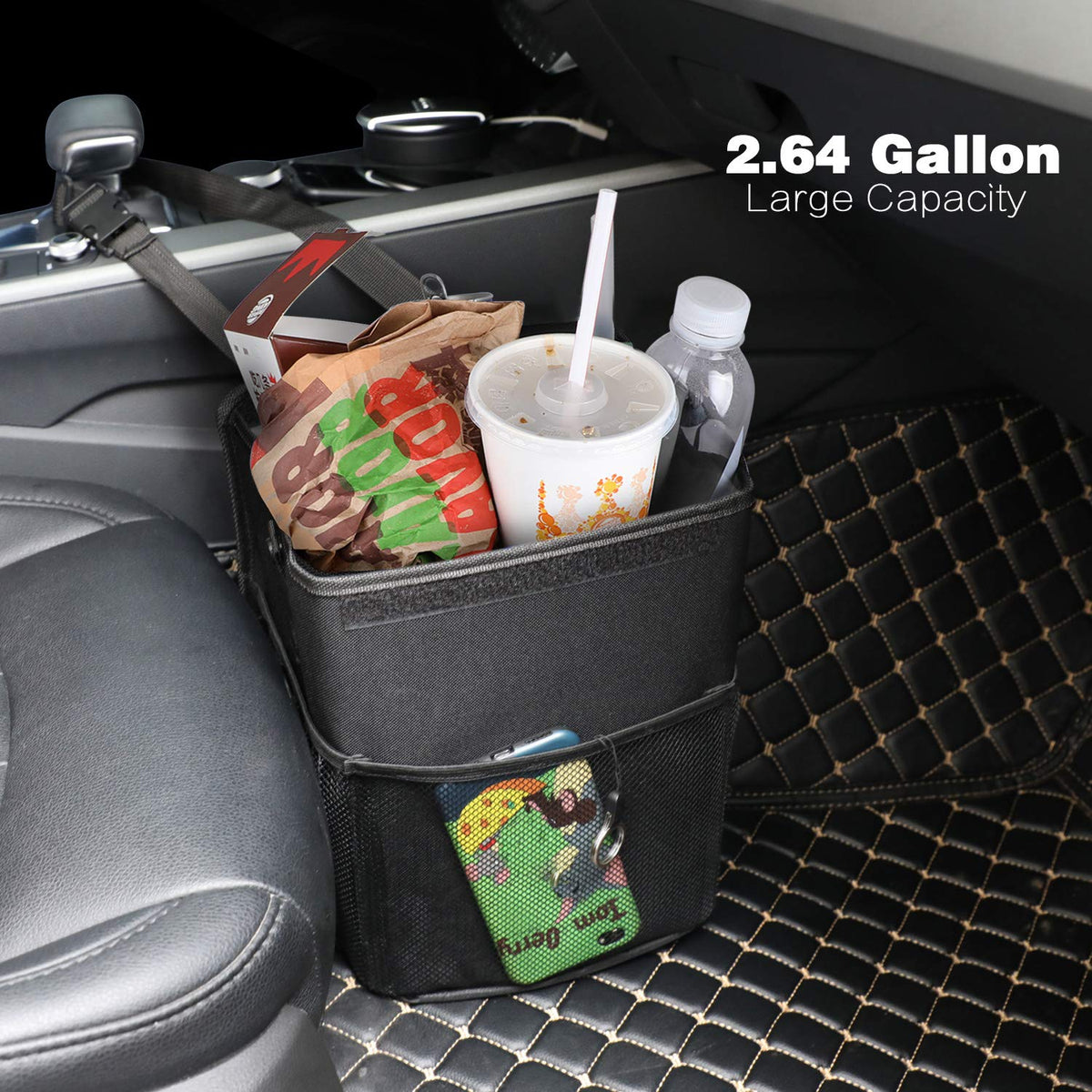 Q: What is the capacity of the PowerTiger car trash can?A: The PowerTiger car trash can has a capacity of 2.64 gallons, making it a compact yet roomy solution for keeping your car clean and organized.