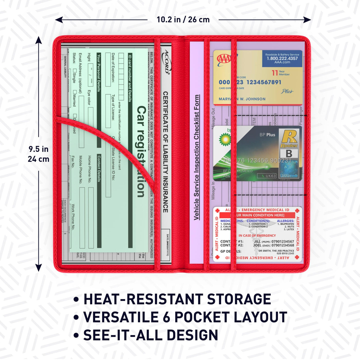 Introducing Moto4X car registration and insurance holder: Keep all your important car documents organized and easily accessible with this car insurance holder. This premium PU leather high quality car registration and insurance card holder is designed to fit perfectly in your glove compartment, providing a secure and convenient storage solution for your license, registration, insurance cards, and other essential documents. With multiple pockets and slots, this car paperwork organizer ensures that everything is neatly organized and protected from damage. The vibrant colors adds a touch of style to your car interior. No more sifting through your glove box, get your car paperwork in order with this must-have insurance and registration holder. Product Dimensions 0.51 x 5.12 x 9.45 inches. Item Weight 6.7 Ounces
