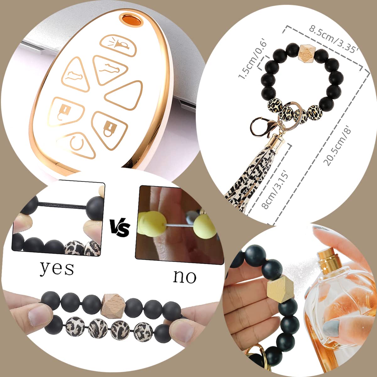 Q: What accessories are included with the key fob cover?A: The package includes one key fob cover, one gold ring keychain, and one silicone bead bracelet key holder, providing added convenience and style.
