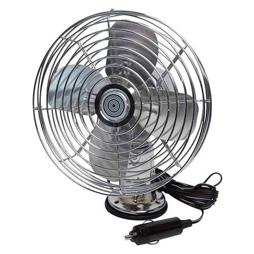 Improve airflow and make your ride more comfortable with this 12V metal fan with a chrome finish. It features a two speed high & low operation and a 10-foot power cord that plugs directly into a 12V power port. The fan includes all the hardware needed to mount on either the top or side panel of the dash and has a swivel-ball base.