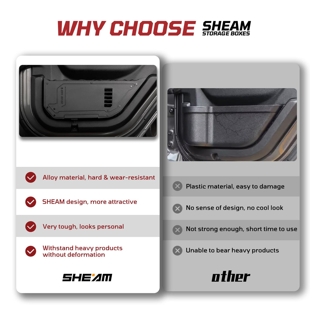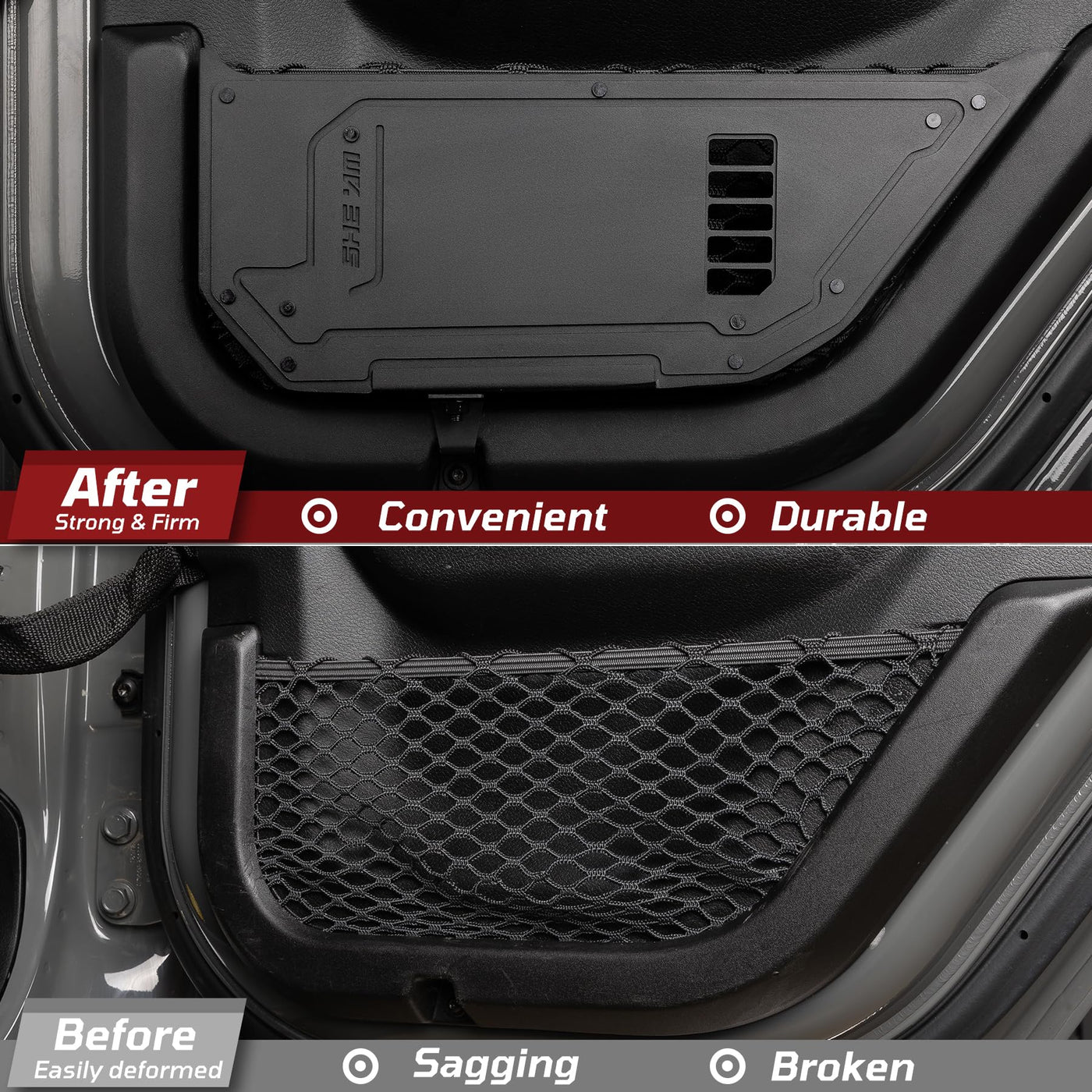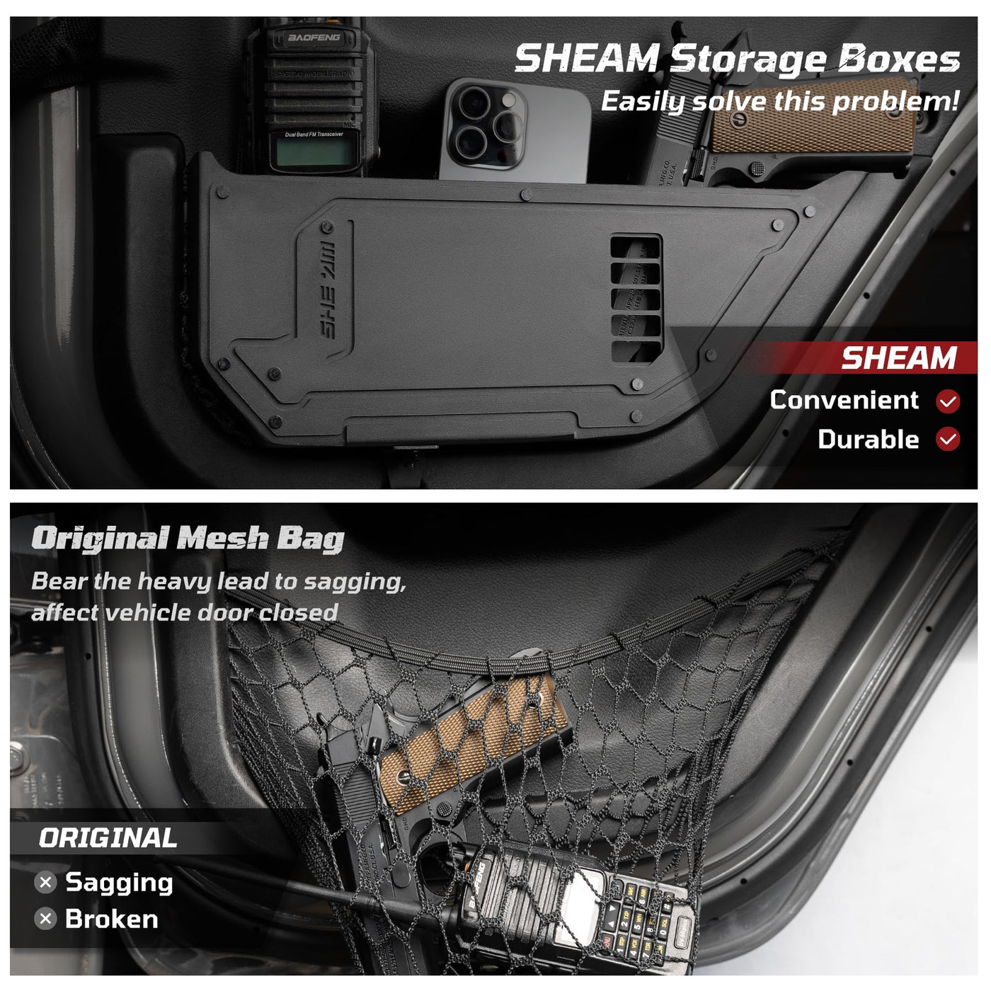 ?Wide Fitment?SHEAM door storage pockets are designed for 2009-2023 Wrangler JK JKU JL JLU and JT 2/4 Door. There are 2 models for you: 2007-2018 Wrangler JK and 2018-2024 Wrangler JL & Gladiator JT.?Excellent Quality?The wrangler door storage is made of high-quality sheet metal parts. Compared to plastic storage boxes, the metal one is more sturdy and textured. This door side storage organizer box take the rough style into design and make your vehicle cooler.?Expansion Storage?These wrangler jl accessories is a perfect substitute for a original saggy net. You can have extend storage space and organize space for your jeep. You can place many items in it, such as a phone, gun, wallet, driver's license, flashlight, tape measure, and so on.without worrying about annoyed looseness and mess.?Easy Installation?No drilling required. We provide installation instruction paper and tools in the package. Just follow the instruction and you can finish the installing in 20 minutes. ?One Year Guarantee?We provide a one-year guarantee for your no worry shopping. If you have any question please be free to contact us. Were more than happy to help you.