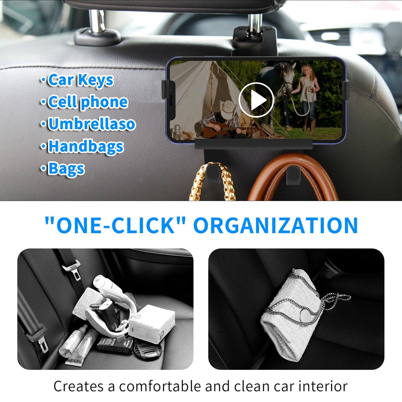 1:Transform your car's interior organization with this innovative 2-in-1 headrest hook and phone holder system. The sleek black design features precise measurements - 6.17 inches in overall length and 2.96 inches in hook position height - ensuring optimal placement for your belongings. 2:Perfect for keeping your vehicle tidy, this versatile organizer lets you hang purses, shopping bags, umbrellas, and other accessories while simultaneously providing a secure mount for your phone to enable backseat entertainment. 3:The thoughtfully engineered design creates a clean, organized car interior with one-click convenience. Ideal for both daily commutes and long road trips, this practical solution helps maintain order while making essential items easily accessible.4: The sturdy construction ensures reliable performance, while the compact profile maintains a streamlined look in your vehicle. Keep your belongings secure and your entertainment within reach with this practical automotive accessory.