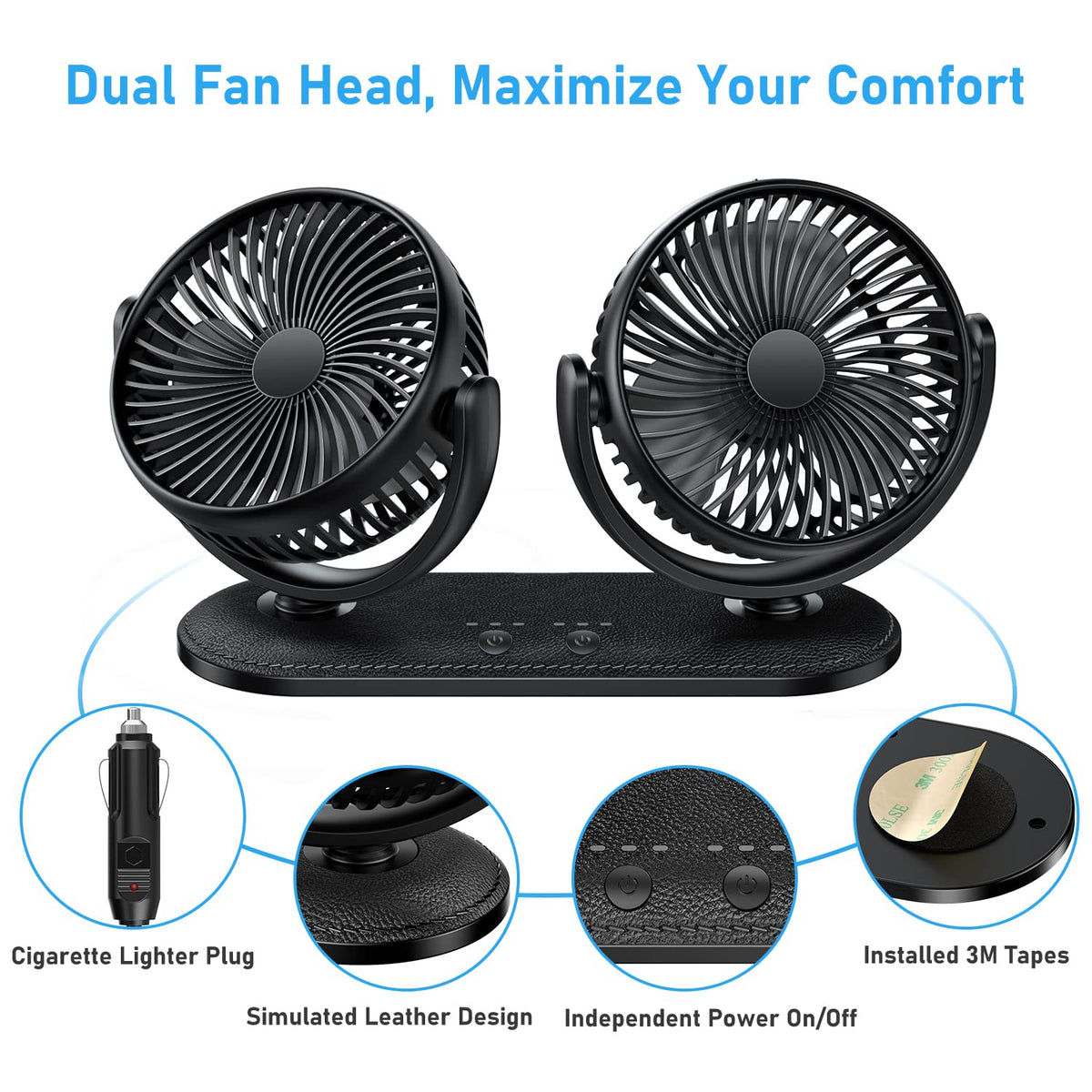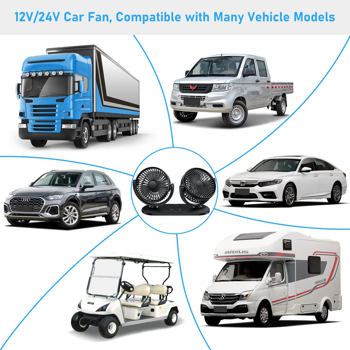 Tripole Car Fan 12V / 24V Portable Auto Cooling Dual Head Rotatable Vehicle Electric Fan For Car, Truck, Suv, Rv, Van, Boat, Gol