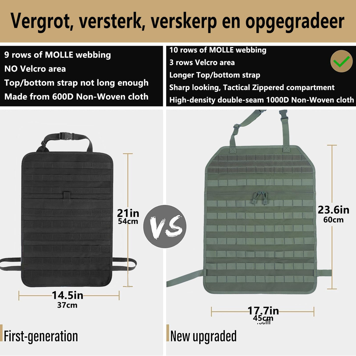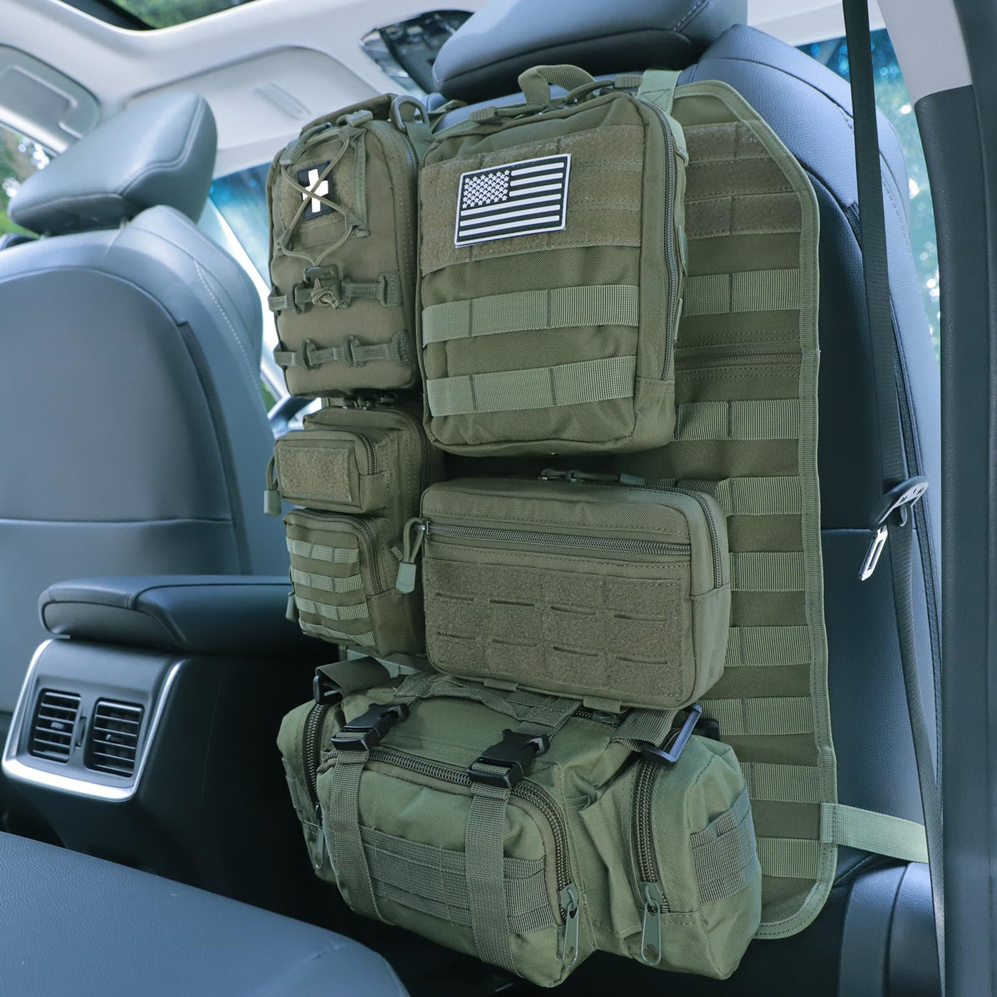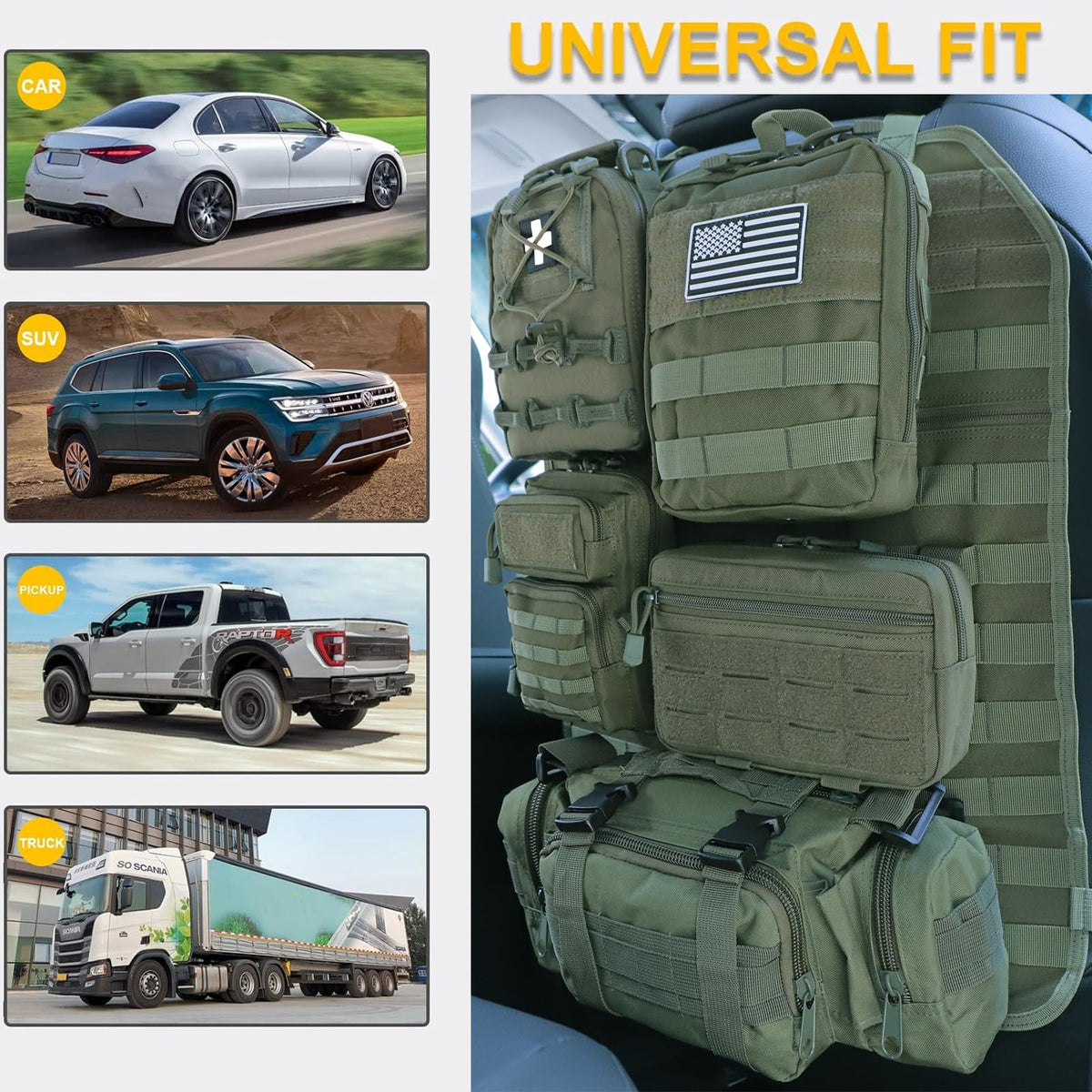 Provide Great storage solution for car!!! Meets you all need of Molle system and extend your car space. You can attach any Molle packs and additional gear and organize your own personal tactical touches. Tactical Seat Back Organizer for All Vehicel Such as Jeep,Truck,SUV, Car, Ford,Chevy,Toyota etc. Product Details: Tactical Seat Back Organizer with 5 Molle bags Tactical medical pouch: Made from 600 denier polyester,durable and breathable, wearproof and washable with tear resistant properties.featuring spacious compartments, this tactical medical pouch keeps bandages, gauze pads, tapes, medicine, shears, and supplies organized make it easy to access. 3C Carry bag: Can store your phone, cards, notebooks and headphones etc.easy to access. Tool Pouch: The inside of the admin pouch has two compartments to hold your items. You can store various tools such as small wrenches, flashlights, cards, folding knives, etc. Molle bag: Made from 600D Non-Woven cloth.Can store various items and tools Tactical Sling Bag/Waist Pack: Storage for hunting and equipment, work tools, camping and adventure gear. One detachable strap in it can make this bag a Waist Pack Molle System panel All molle straps, it designed for attach extra tool pouch,extend your storage space. Your can attach any Molle packs and additional gear and organize your own personal tactical touches.