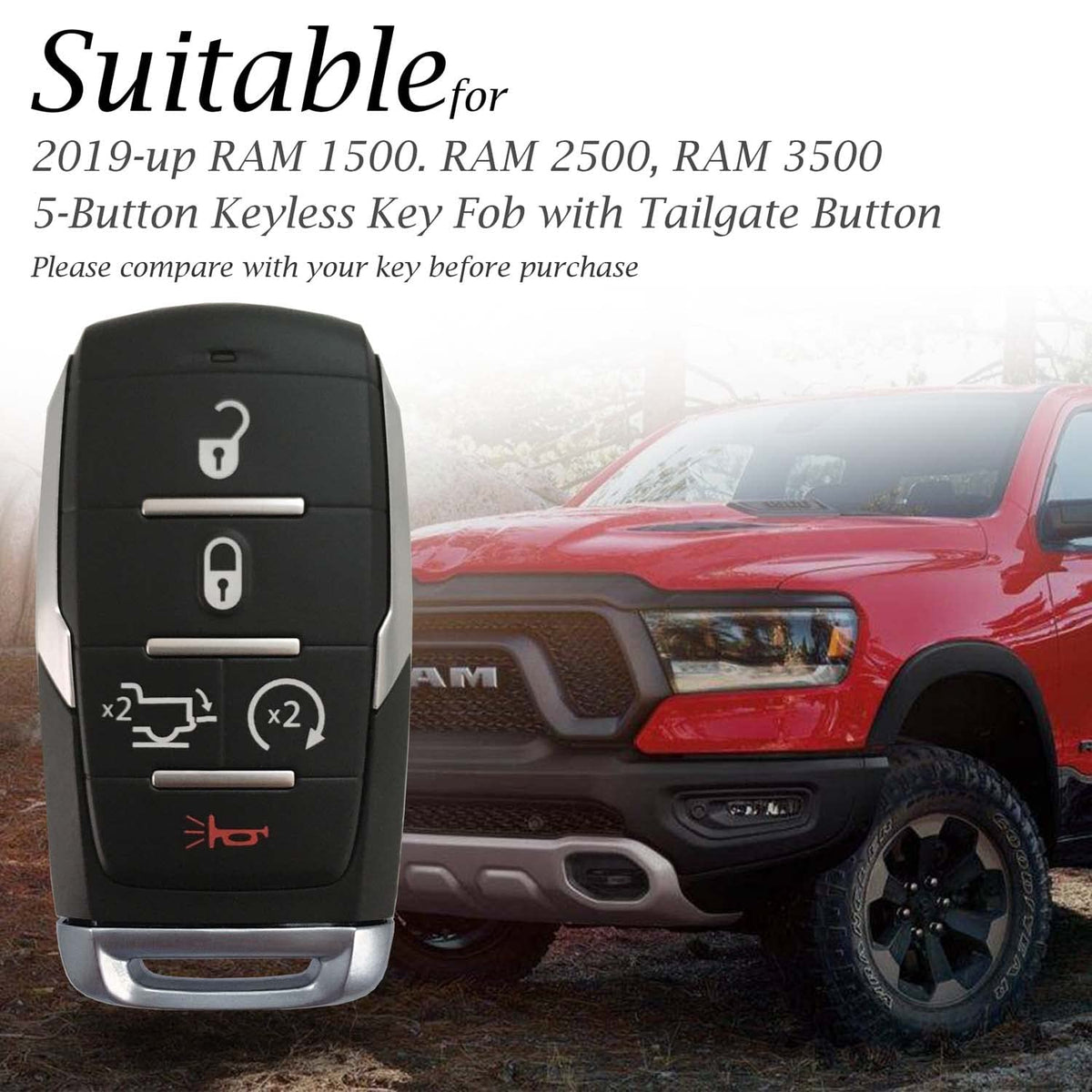 Weight: 2 OZ Material: 100% Real Genuine Leather Package Included: 1 X Leather Key Case, and 1 X Key Chain Clip. (Note: Key Fob is not included) Suitable Key: 2Compatible for RAM 1500, RAM 2500, RAM 3500 2019 - 2025 with 5-Button Smart Key fob ( Only for Tailgate Button) This Leather key case by Vitodeco is the perfect way to provide full protection and fashion to the smart key of your vehicle. It is constructed from durable, high quality materials, with vibrant colors that are easily cleaned with soap and water.