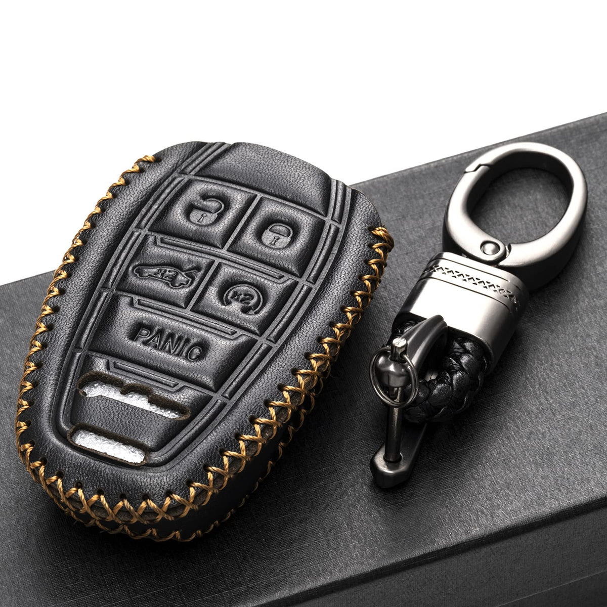 Q: What material is the key fob case made from?A: The key fob case is made from 100% genuine premium cowhide leather, providing both durability and a stylish appearance while ensuring full protection for your key fob.