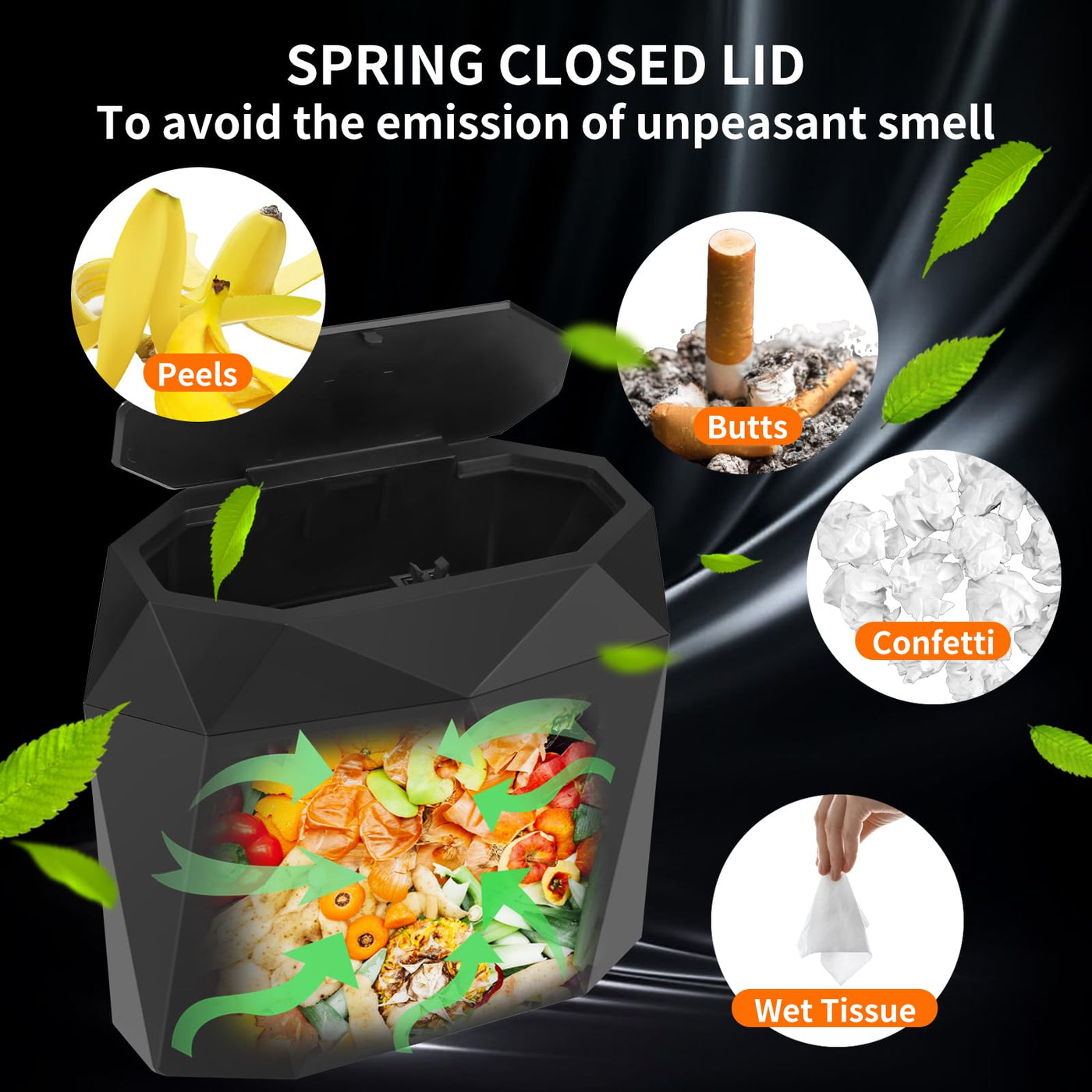 Wontolf Mini Car Trash Can Bin With Lid, Small Car Garbage Can With 60Pcs Trash Bags, Abs Diamond Design Dustbin Car Organizer Container Car Accessories For Car/Office/Home Black