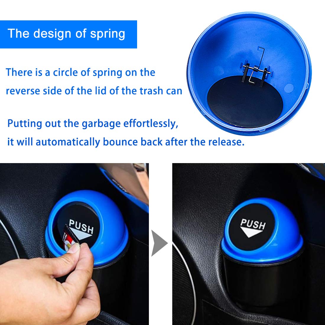 Product Name : Car Trash Can;Material : PlasticColor : Blue, Beige LidSize : 20 x 9.5cm/8' x 3.7' (H*D)Weight : 93gPackage content : 2 x Car Trash CanCan be used in car, home, office, etc, can be used as trash can, ashtray, cup holder or coins holder. The lid is made of the plastic material.