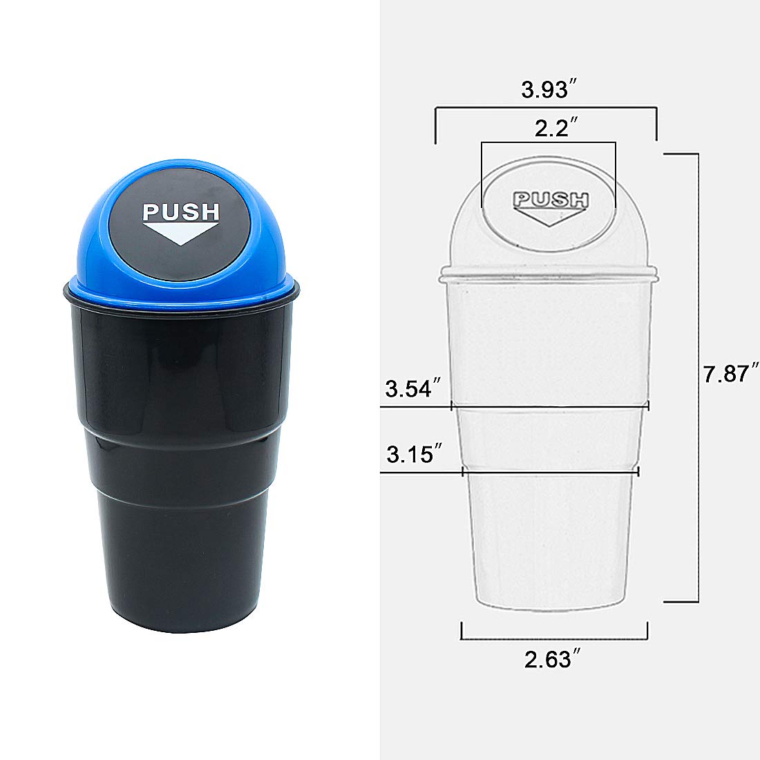 Q: What are the dimensions of the YIOVVOM Car Garbage Can?A: The YIOVVOM Car Garbage Can measures 8 inches in height and has a base diameter of 2.5 inches, with a top diameter of 3.7 inches, making it a compact solution for your vehicle.