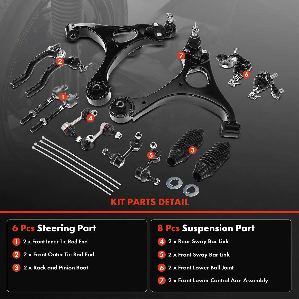 A-premium Control Arm Kits are an ideal choice to replace your broken Control Arm Kits. All Control Arm Kits meet or exceed OEM specifications. Due to high manufacturing standard, it will come with one year quality guarantee. Compatible with Honda Models: 2006-2011 Civic L4 1.8L Standard Design Kit Parts Included: 1x Front Left Lower Control Arm and Ball Joint Assembly Part Number# K620382, RK620382 1x Front Right Lower Control Arm and Ball Joint Assembly Part Number# K620383, RK620383 1x Right Outer Tie Rod End Part Number# ES800373 1x Left Outer Tie Rod End (Standard Design) Part Number# ES800374 2x Inner Tie Rod End Part Number# EV800246 1x Front Right Stabilizer Bar Link Part Number# K80768 1x Front Left Stabilizer Bar Link Part Number# K80769 1x Front Left Lower Ball Joint Part Number# K500070 1x Front Right Lower Ball Joint Part Number# K500069 1x Rear Left Stabilizer Bar End Link Part Number# K750125 1x Rear Right Stabilizer Bar End Link Part Number# K750126 2x Rack and Pinion Bellow (Cut To Fit) OEM Number: K620382, K620383, K500069, K500070, K80768, K80769, K750125, K750126, ES800374, ES800373, EV800246 Location: Front & Rear Quantity Sold: A Set of Fourteen Pieces Note: EV800246- Inner Tie Rod End with 18 (mm) Thread At Steering Gear; K500069-Suspension Ball Joint -- Bolt-On Type; K500070-Suspension Ball Joint -- Bolt-On Type; K750125-Suspension Stabilizer Bar Link -- Link With 2 Stud(s); K750126 Suspension Stabilizer Bar Link -- Link With 2 Stud(s)