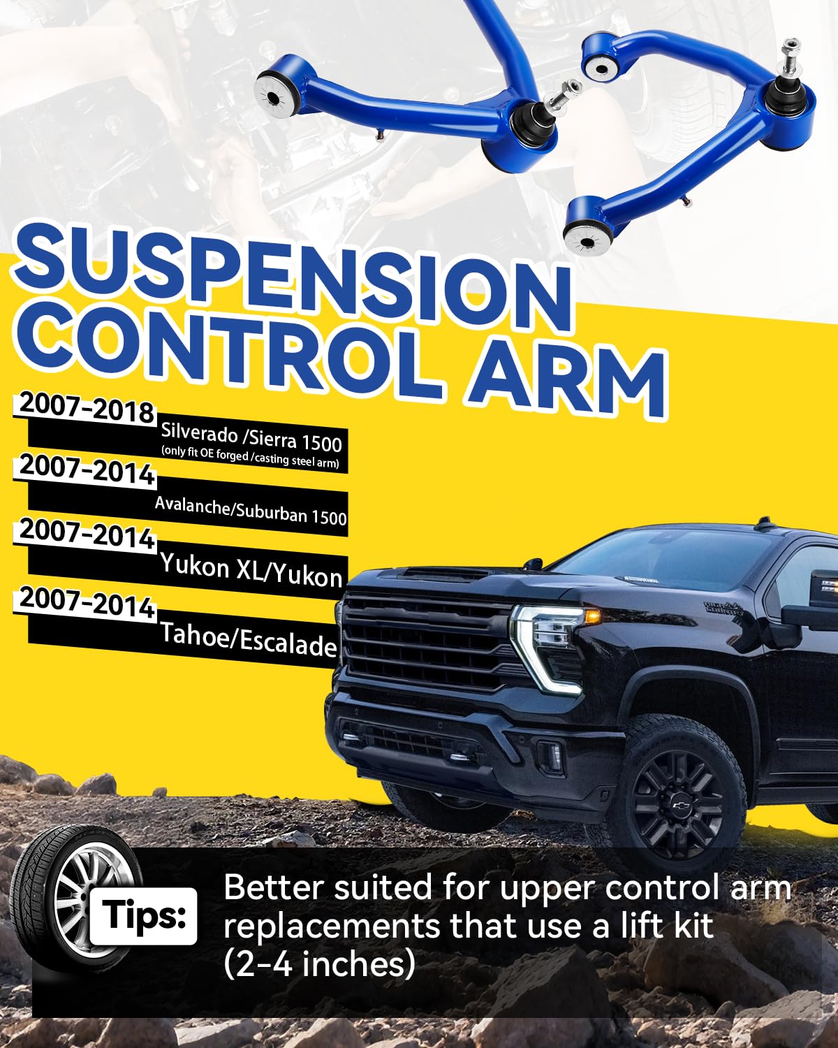 Front Upper Control Arms for 2007-2018 Silverado 1500 Sierra 1500 (OE Forged Factory Cast Steel Arms), 2-4 Lift 2 PCS Blue Tubular Suspension Control Arm for 2007-2014 Tahoe Suburban Yukon
