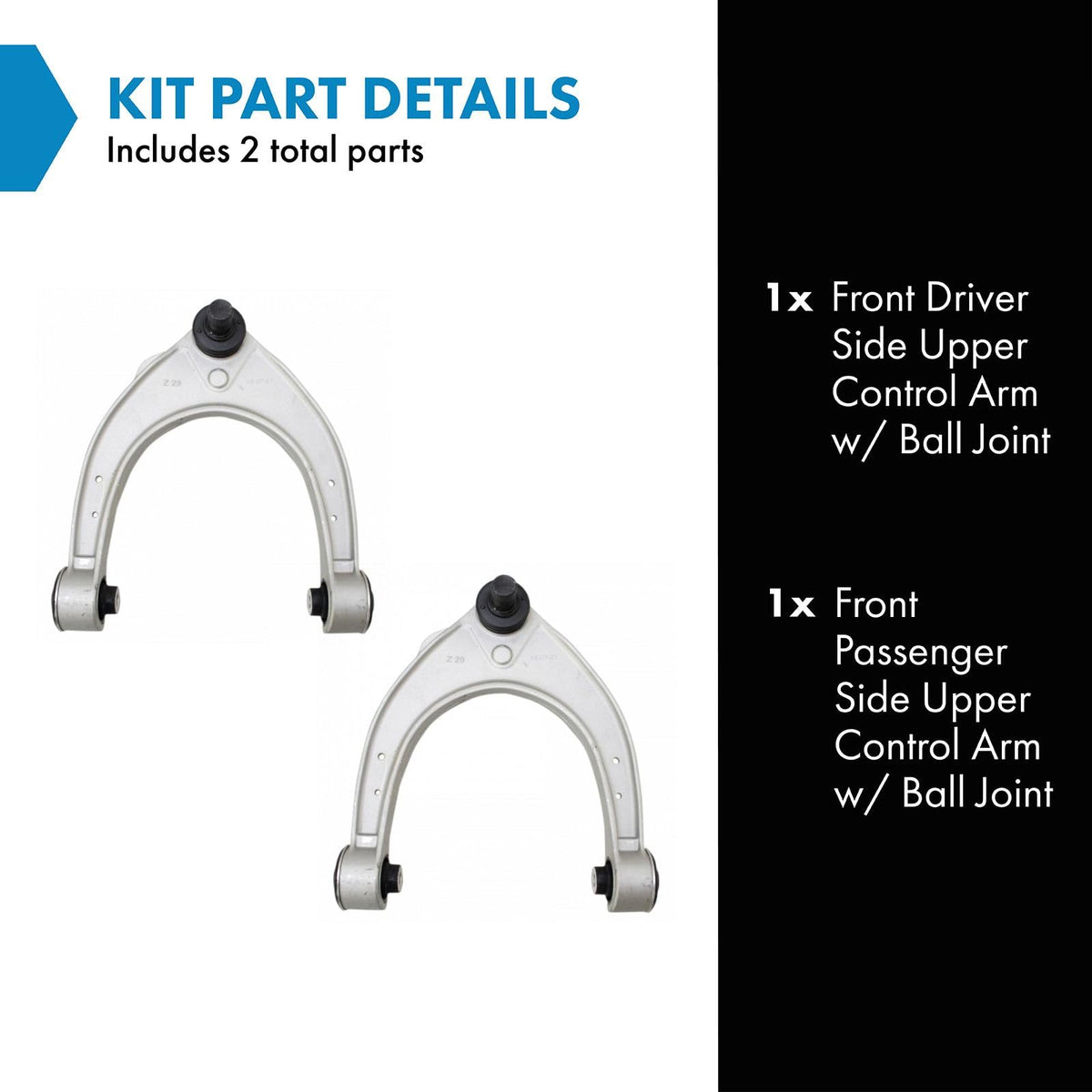 2 Piece Control Arm with Ball Joint SetKit Includes(1) Front Driver Side Upper Control Arm with Ball Joint(1) Front Passenger Side Upper Control Arm with Ball JointFitmentCompatible with: 2011-16 BMW 528i Front Driver & Passenger Side UpperCompatible with: 2011-16 BMW 535i Front Driver & Passenger Side UpperCompatible with: 2011-16 BMW 535i xDrive Front Driver & Passenger Side UpperCompatible with: 2012-16 BMW 528i xDrive Front Driver & Passenger Side UpperCompatible with: 2011-16 BMW 550i Front Driver & Passenger Side UpperCompatible with: 2011-16 BMW 550i xDrive Front Driver & Passenger Side UpperCompatible with: 2012-18 BMW 650i Front Driver & Passenger Side UpperCompatible with: 2009-12 BMW 750Li Front Driver & Passenger Side UpperCompatible with: 2013-19 BMW 640i Gran Coupe Front Driver & Passenger Side UpperCompatible with: 2013-19 BMW 650i Gran Coupe Front Driver & Passenger Side UpperCompatible with: 2014-17 BMW i8 Front Driver & Passenger Side UpperCompatible with: 2012-18 BMW 650i xDrive Front Driver & Passenger Side UpperCompatible with: 2012-17 BMW 640i Front Driver & Passenger Side UpperCompatible with: 2009-12 BMW 750i Front Driver & Passenger Side UpperCompatible with: 2010-12 BMW 750Li xDrive Front Driver & Passenger Side UpperCompatible with: 2014-16 BMW 535d Front Driver & Passenger Side UpperCompatible with: 2011-17 BMW 535i GT Front Driver & Passenger Side UpperCompatible with: 2011-17 BMW 535i xDrive GT Front Driver & Passenger Side UpperCompatible with: 2013-19 BMW 650i Gran Coupe xDrive Front Driver & Passenger Side UpperCompatible with: 2014-16 BMW 535d xDrive Front Driver & Passenger Side UpperCompatible with: 2014-19 BMW 640i xDrive Gran Coupe Front Driver & Passenger Side UpperCompatible with: 2011-12 BMW 740Li Front Driver & Passenger Side UpperCompatible with: 2011-12 BMW Alpina B7 Front Driver & Passenger Side UpperCompatible with: 2011-12 BMW 740i Front Driver & Passenger Side UpperCompatible with: 2011-17 BMW 550i xDrive GT Front Driver & Passenger Side UpperCompatible with: 2011-12 BMW Alpina B7 xDrive Front Driver & Passenger Side UpperCompatible with: 2010-15 BMW 550i GT Front Driver & Passenger Side UpperCompatible with: 2010-12 BMW 750i xDrive Front Driver & Passenger Side UpperCompatible with: 2019 BMW i8 Front Driver & Passenger Side UpperCompatible with: 2011-12 BMW Alpina B7L Front Driver & Passenger Side UpperCompatible with: 2014-17 BMW 640i xDrive Front Driver & Passenger Side UpperCompatible with: 2011 BMW Alpina B7L xDrive Front Driver & Passenger Side UpperCompatible with: 2012-16 BMW ActiveHybrid 5 Front Driver & Passenger Side UpperCompatible with: 2016 BMW Alpina B6 xDrive Gran Coupe Front Driver & Passenger Side UpperCompatible with: 2010-12 BMW 760Li Front Driver & Passenger Side UpperCompatible with: 2018 BMW 640i Convertible Front Driver & Passenger Side UpperCompatible with: 2018 BMW 640i xDrive Convertible Front Driver & Passenger Side UpperProduct AttributesQuantity: 2 PieceReference NumbersBMW: 31126775967Delphi: TC3224Dorman - OE Solutions: 522-653Hollander: 511-50205Mevotech Supreme: CMS101174Mevotech: CMS101174MOOG Chassis Products: RK621905RTS: 96-99573