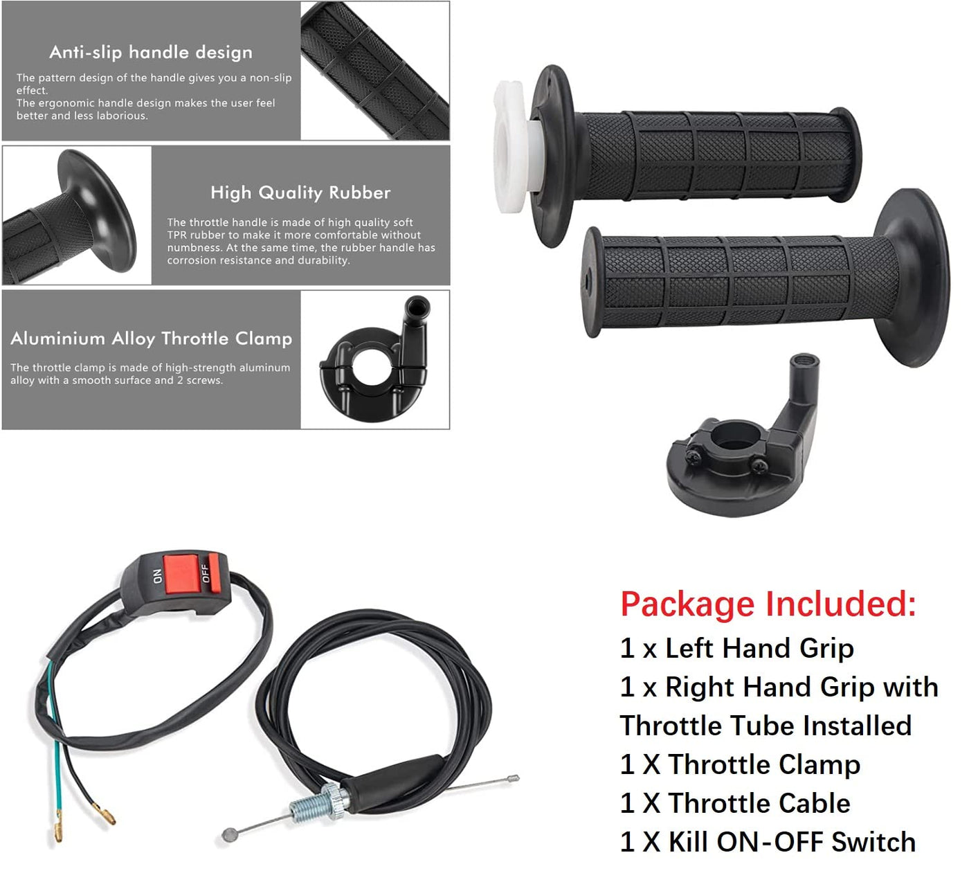 22mm Twist Throttle Accelerator Handle Grips Compatible with baja mb165 196cc 5.5hp mini bike, for most of 50cc, 90cc, 110cc 125cc 140cc 150cc 200cc & 250cc 4-stroke dirt bike. Package Included: 1* 1.2 m throttle line 2* left and right handles 1* throttle aluminum block 1* flameout switch Colour: Black Material: rubber + plastic Throttle Handle Grips and Cable Fits for 7/8'' ( 22mm) ATV/ATC/Bike bar dirt bike. Throttle Accelerator Handle Grips and Cable Set for 50-1000cc dirt bike atv chopper. Throttle Handle Grips and Cable compatible with most of 50cc, 80cc, 90cc, 110cc 125cc 140cc 150cc 200cc & 250cc 4-stroke dirt bike, mini bike, pocket bike. Throttle Handle Grips and Cable fits mini baja mb165 196cc 5.5hp. Throttle Handle Grips and Cable fits mini baja mb200 200cc 6.5hp. Throttle Handlebar Assistant,Scooter Throttle Cable,SSR 125 Throttle Cable,Throttle Cable Kit,PW50 Throttle Cable,7/8 Throttle Assembly,Kawasaki Throttle cable,110 throttle cable,Twist Throttle Accelerator Handle Set,Throttle Clamp Assembly,PW80 Throttle cable,Throttle assembly works with: Baja DoodleBug Baja Mini Baja Baja Blitz Baja Racer This listing features a set of throttle grip with cable and housing clamp replacement, made of high quality plastic and aluminium alloys, anti-corrosion and rust, fits most Chinese 50cc, 90cc, 110cc 125cc & 140cc 4-stroke dirt bike, mini bike, pocket bike with 7/8''(22mm) bar.