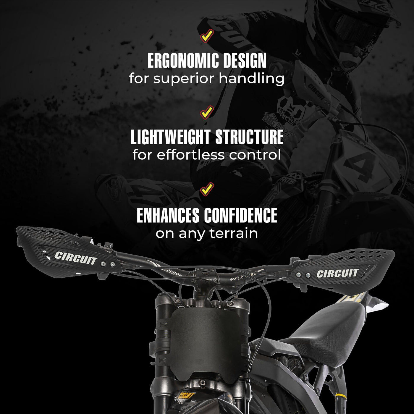 ?RUGGED HAND AND LEVER COVERAGE?Constructed with tough nylon temples and flexible polymer - thickness of approximately 12 mm - helps protect your hands and controls from rocks, mud, branches and other trail hazards. | ?UNIVERSAL INSTALLATION FLEXIBILITY?Designed for off-road, on-road and even on-road applications, its adjustable temples can be mounted above or below the levers, helping to provide a practical and adaptable solution for a wide range of models. Length: 170 mm. | ?LIGHTWEIGHT DURABILITY?The two-tone construction features tough materials that provide flexibility without adding unnecessary weight to your handlebars. | ?CARBON LOOK AND TEXTURE?With a modern design and a carbon with an average thickness of 4 mm fiber-like structure finish, this hand guard gives your ride a sporty aesthetic. | ?CIRCUIT EQUIPMENT EXCELLENCE?A reference in two-wheel accessories since 1984, Circuit Equipment is recognized for its innovation and durability, offering cutting-edge solutions for motocross, enduro and street bikes worldwide.