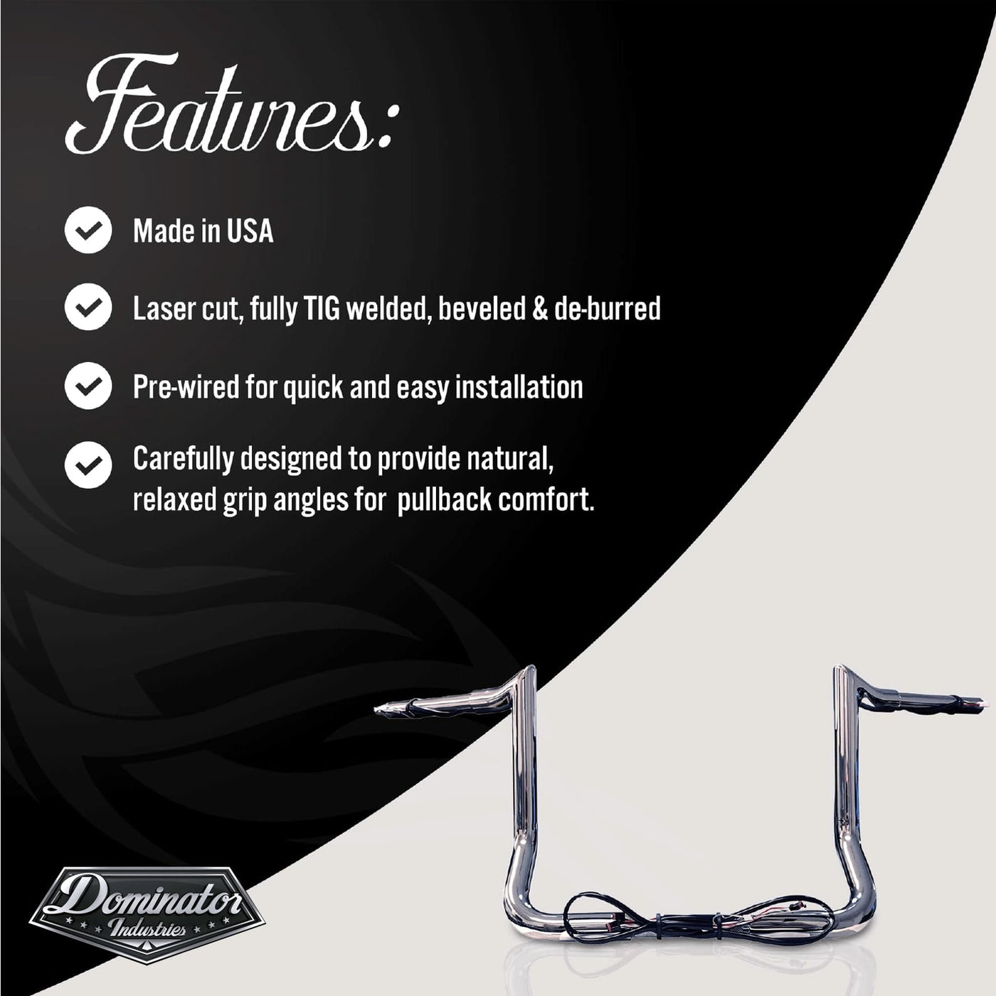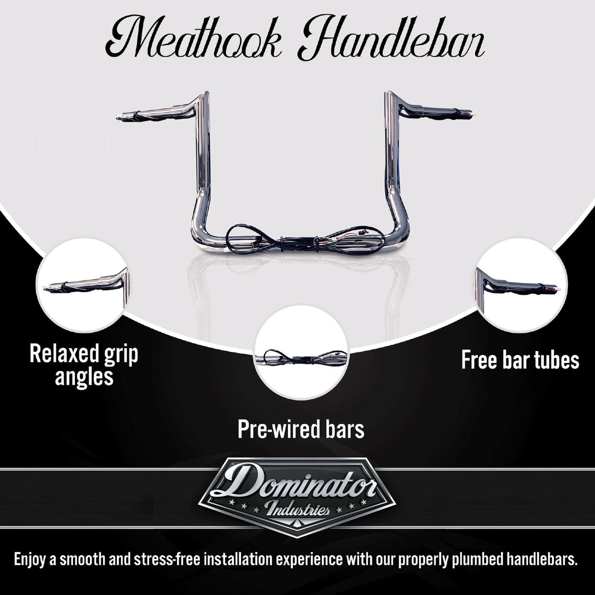 Dominator Industries 1 1/4' Pre-Wired 12' Meathook Bar Ape Hanger Handlebar Compatible With 2014-2023 Harley-Davidson Bagger Touring Electra, Street Glide, Special, Ultra Limited, Low (Chrome)