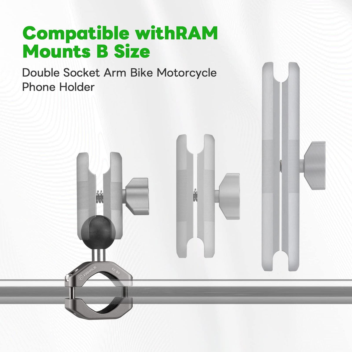 Q: What devices are compatible with the FANAUE Handlebar Clamp Mount?A: The FANAUE Handlebar Clamp Mount is designed to securely hold devices such as smartphones and GPS devices. It is compatible with RAM Mounts B Size Double Socket Arms and various motorcycle phone mount holders, making it a versatile choice for cyclists and motorcyclists.
