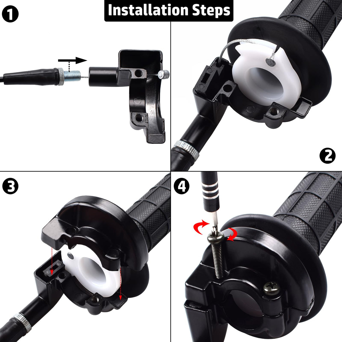 Q: What does the package include when purchasing this throttle assembly?A: The package includes 2 throttle grips, 1 throttle cable, 1 throttle housing clamp, 1 wrench, and 2 cable ties, providing everything needed for installation and use.