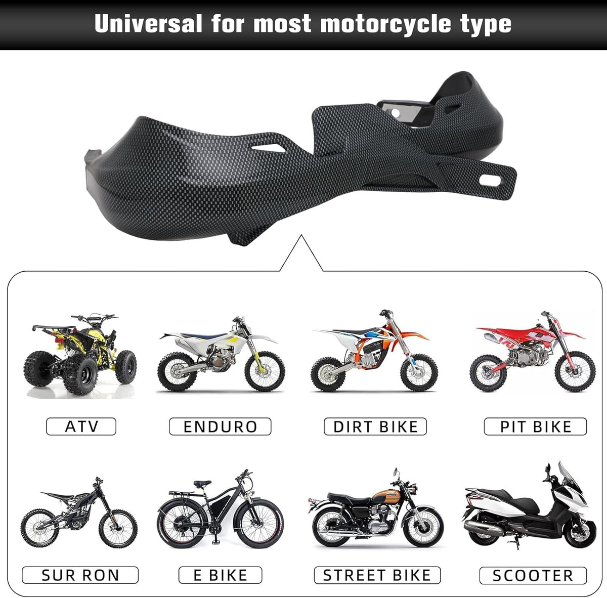 Handguards Fitment: Fit All Handlebars Range 7/8'' 22mm and 1 1/8'' 28mm. Hand Guards Features: 100% Brand New, Never Mounted. Have Plenty of Room for Cables and Brake Lines Efficiently Protect Hands While Driving. Reduce Your Hands or Fingers Fatigue. Protect Your Hands from Brush, Rocks, Mud and Cold Wind. Fashionable Appearance -- A New Imitation Carbon Fiber Appearance. Note: There are not Made of Carbon Fiber. Original Aluminum Bar -- Dirt Bike Hand Guards Avoid Painting Shedding. Still Looks New after Using for Long Time. Specification: Color: Imitation Carbon Fiber. Material: PP Plastic and Aluminum Alloy. Package Includes: A Set of Dirt Bike Hand Guards and Fitting Kit. Installation Instruction NOT Included.